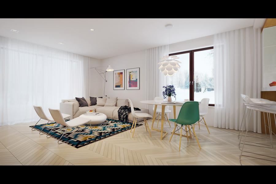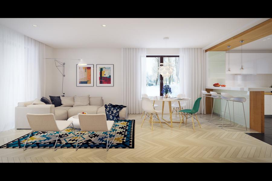 🛋️ Otwarta strefa dzienna: Jasny salon połączony z kuchnią, z bezpośrednim wyjściem na duży, zadaszony taras.
