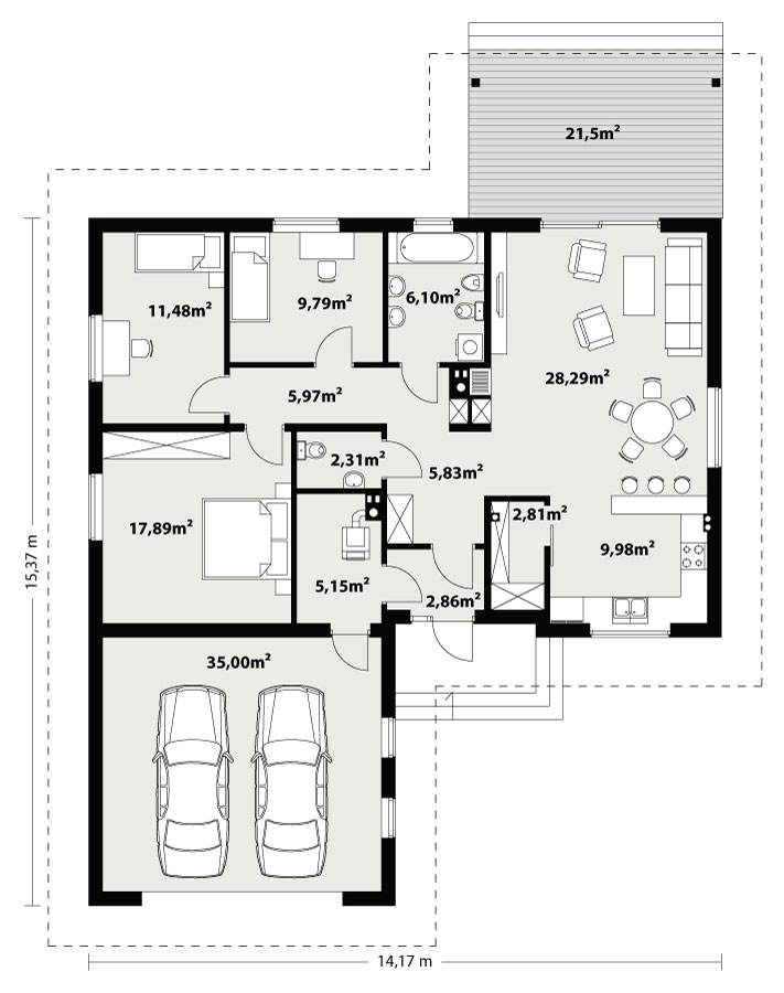 Projekt Abra 2 drewniana to idealna propozycja dla inwestorów szukających komfortowego, parterowego domu jednorodzinnego bez podpiwniczenia. Budynek charakteryzuje się nowoczesną, minimalistyczną bryłą, którą urozmaica zintegrowany, dwustanowiskowy garaż. Elewacja wykończona jasnym tynkiem świetnie współgra z dachem, który można pokryć elegancką dachówką lub blachodachówką. Konstrukcja oparta na technologii szkieletu drewnianego sprawia, że dom jest nie tylko ekologiczny, ale również szybki i tani w budowie.
