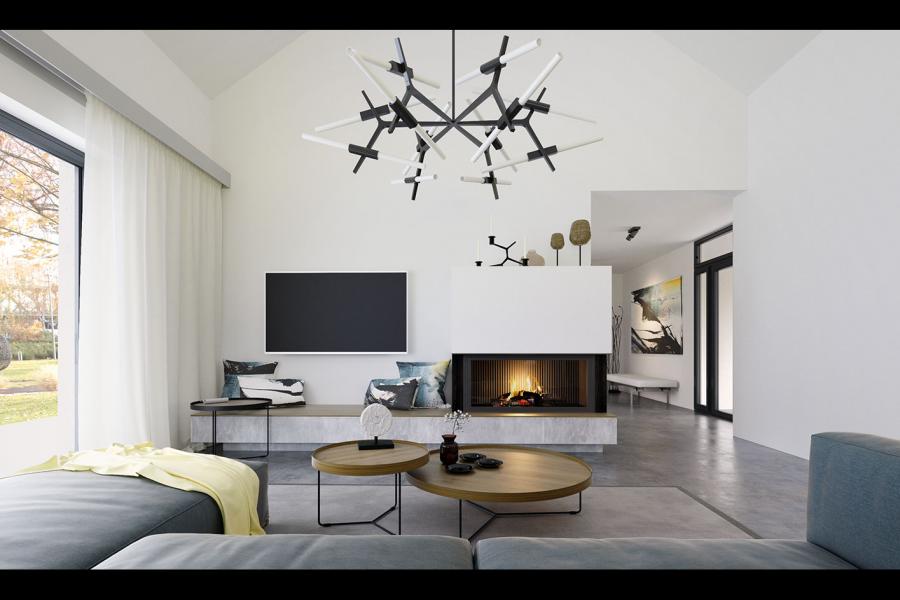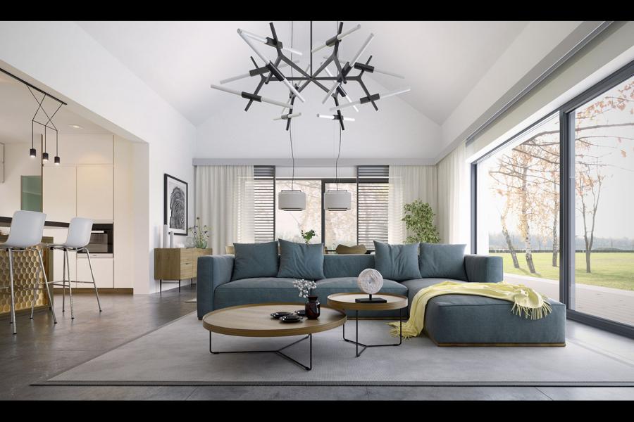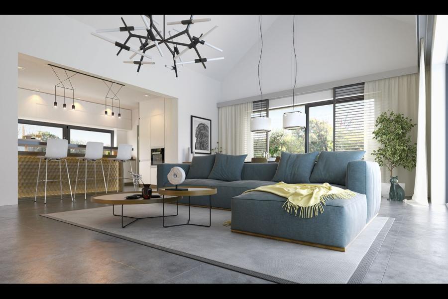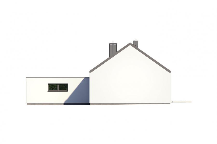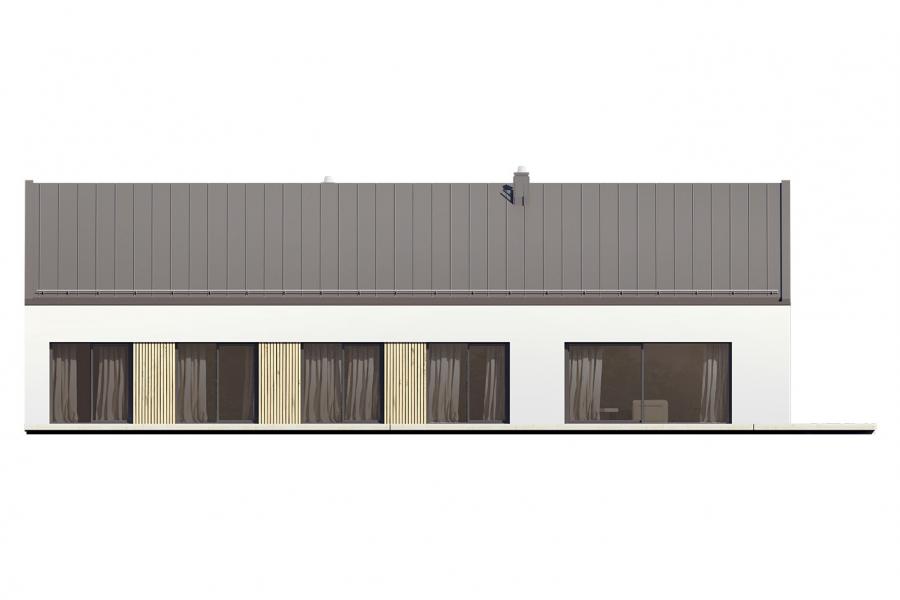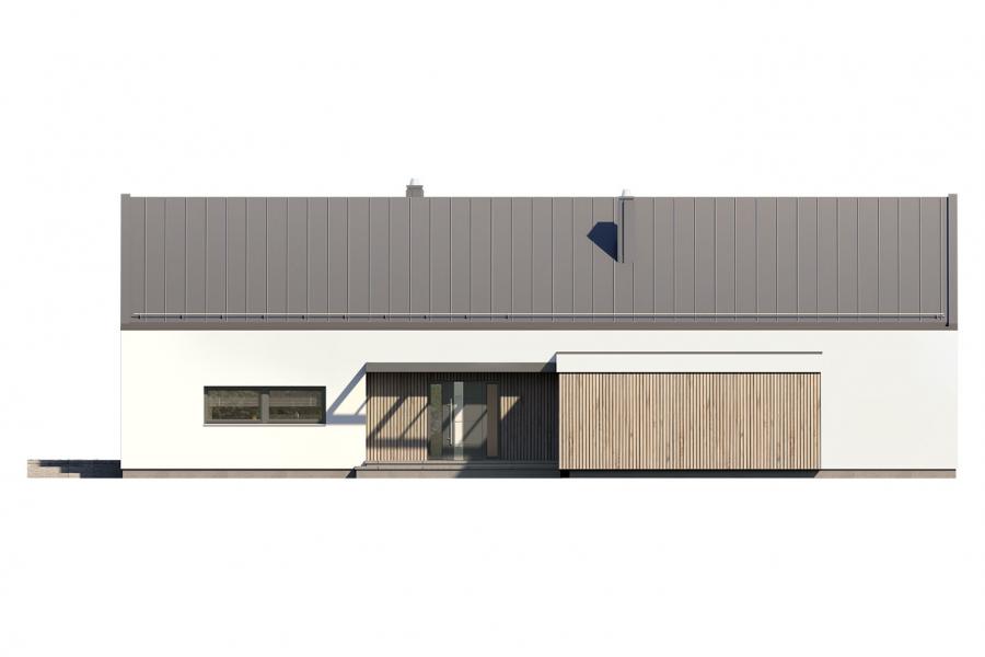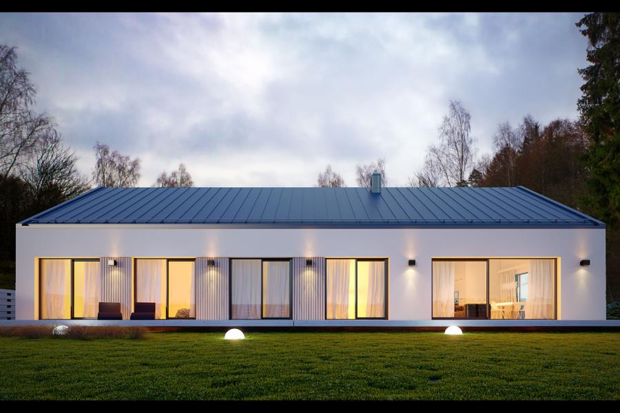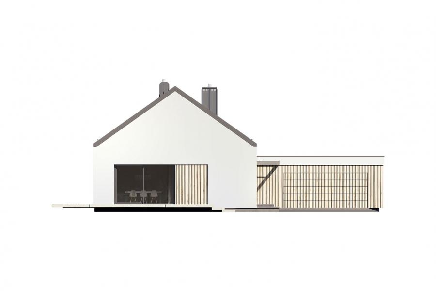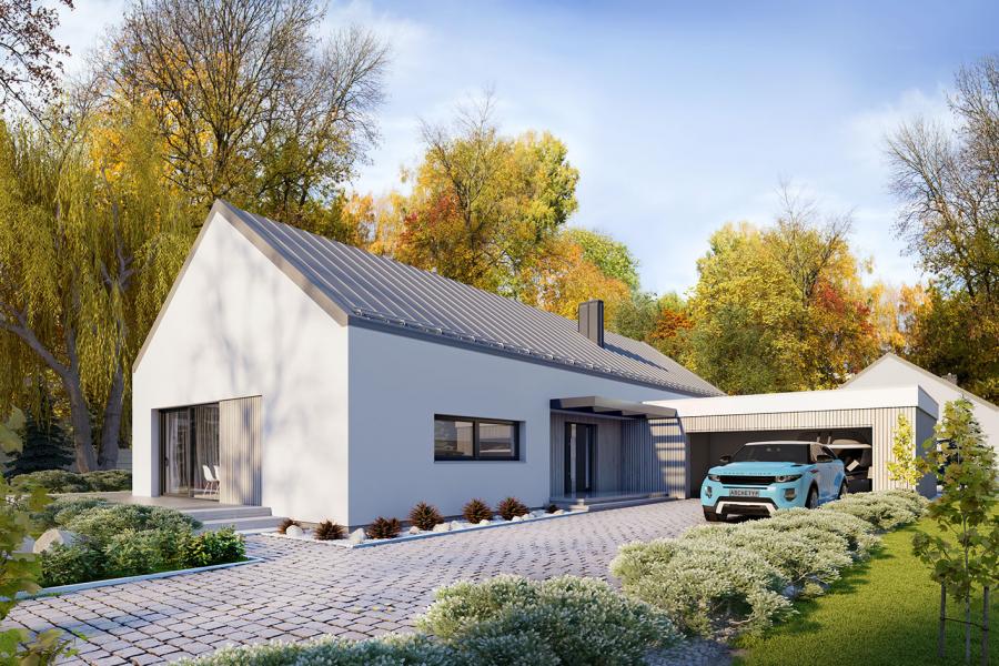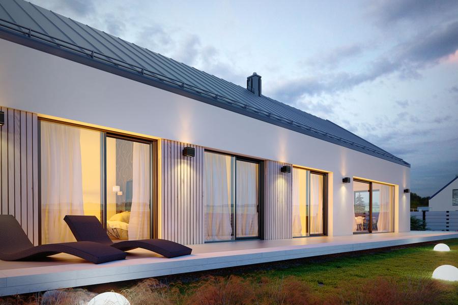 Projekt Alfi 2 to propozycja nowoczesnego domu parterowego z przestronnym dwustanowiskowym garażem. Poprzez układ na rzucie prostokąta, prostą bryłę przykrytą dwuspadowym dachem bez okapów oraz szereg przeszkleń obiekt utrzymany jest w stylistyce tzw. nowoczesnej stodoły. Współczesny, minimalistyczny charakter budynku uzyskano dzięki elewacjom wykończonym białym tynkiem, urozmaiconym szalówką w kolorze naturalnego drewna, które idealnie komponują się z szarą blachą na rąbek. Dom Alfi 2, który kształtem nawiązuje do tradycyjnych wzorców typowych dla terenów wiejskich, we wnętrzu zachował bardzo przejrzysty i funkcjonalny program użytkowy dla 4-5 osobowej rodziny. Układ domu został podzielony na 3 strefy, gdzie część dzienna to przestronny salon z jadalnią, kuchnia ze spiżarnią oraz gabinet. Strefa intymna składa się z 3 sypialni i łazienki, z czego największa sypialnia ma własną garderobę i łazienkę. Część gospodarcza to dwustanowiskowy garaż, kotłownia i pralnia. Niewątpliwym atutem projektu jest zastosowanie dużego tarasu oraz licznych przeszkleń zarówno w części dziennej, jak i w każdej z sypialni, co pozwala na otwarcie domu "na zewnątrz" i cieszenie się z pięknych, naturalnych walorów działki.