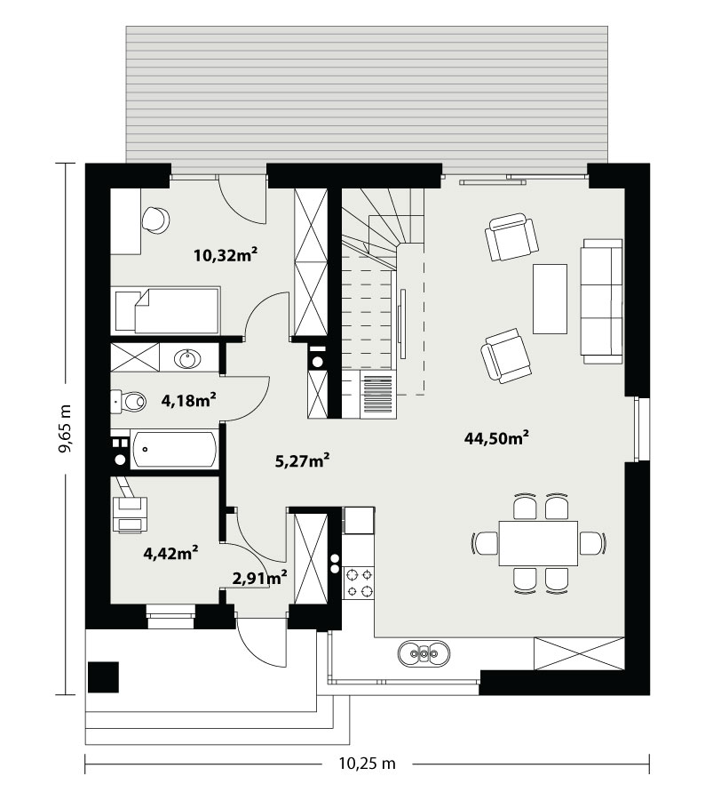 | KubaturaObjętość budynku, liczona zgodnie z normą PN-ISO-9836:1997, czyli wraz z przegrodami zewnętrznymi i wewnętrznymi (ścianami, stropem, dachem i podmurówką). | 630 m³ |