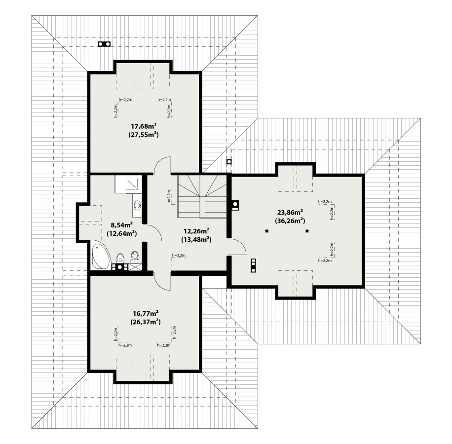 | Powierzchnia użytkowaDla domów parterowych: Suma powierzchni użytkowych wszystkich pomieszczeń bez garażu. Dla domów z poddaszem (dach spadzisty): Suma powierzchni użytkowych wszystkich pomieszczeń bez garażu i strychu. Na poddaszu, pod skosami dachu powierzchnię użytkową liczono wg zasady: - powyżej 2,2m wysokości pomieszczenia powierzchnia liczona w 100%, - pomiędzy 1,4m a 2,2m w 50%, - poniżej 1,4m powierzchnia nie jest brana pod uwagę. | 216.98 m² |