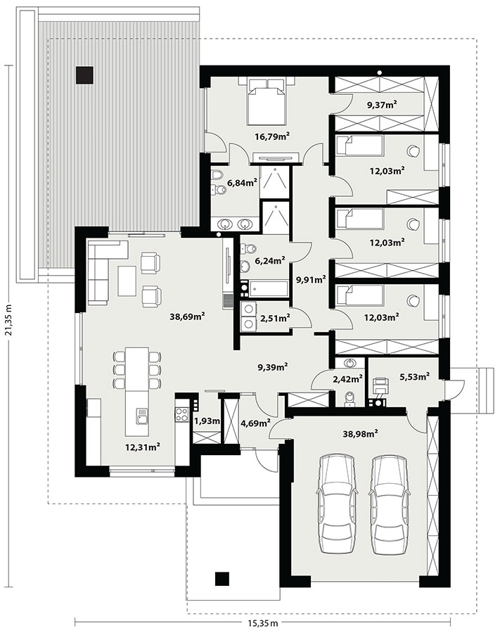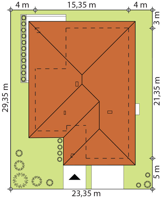 | Powierzchnia zabudowyPowierzchnia terenu, zajęta przez budynek w stanie wykończonym, bez tarasów, schodów zewnętrznych i podjazdów (PN-ISO 9836: 1997) | 253.34 m² |
