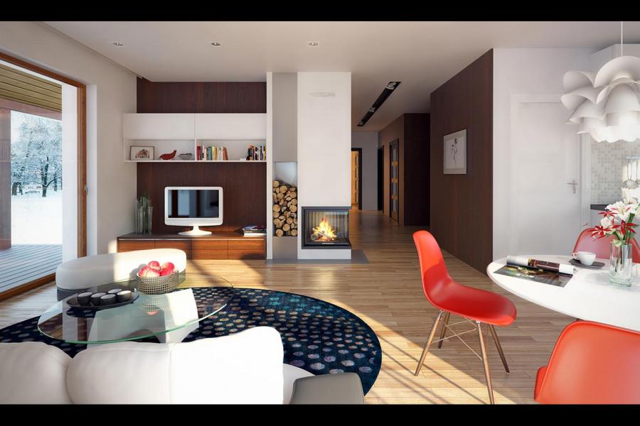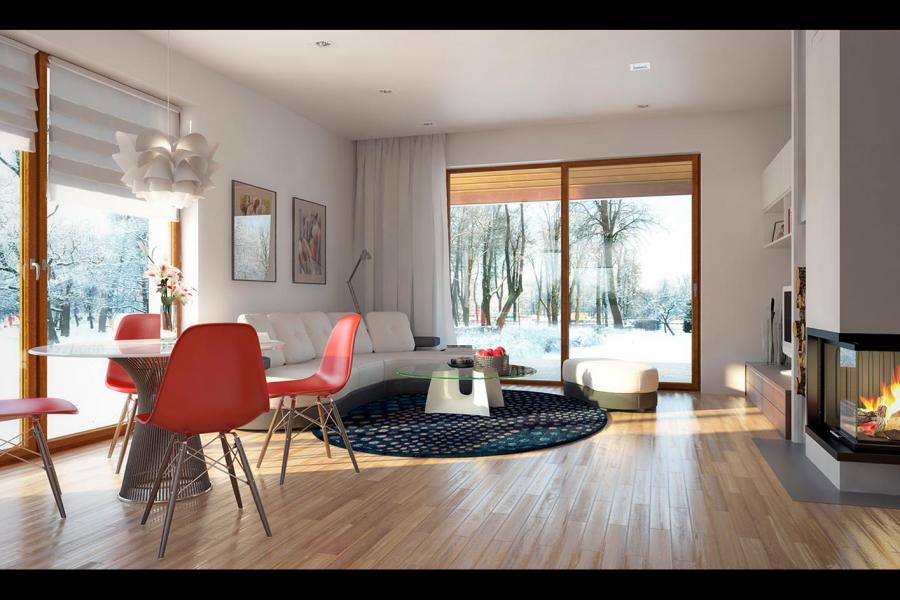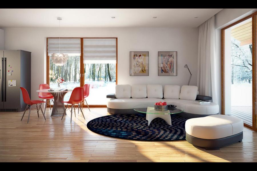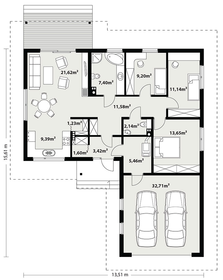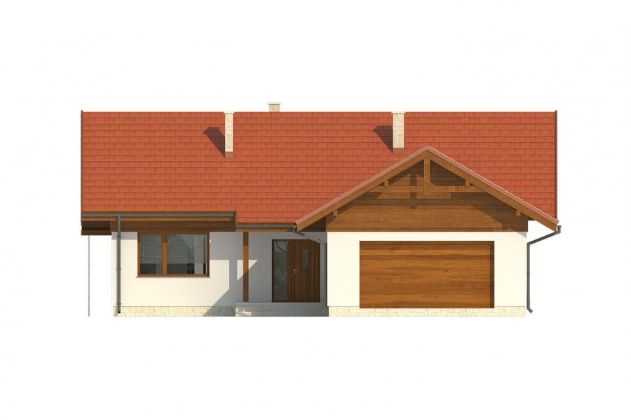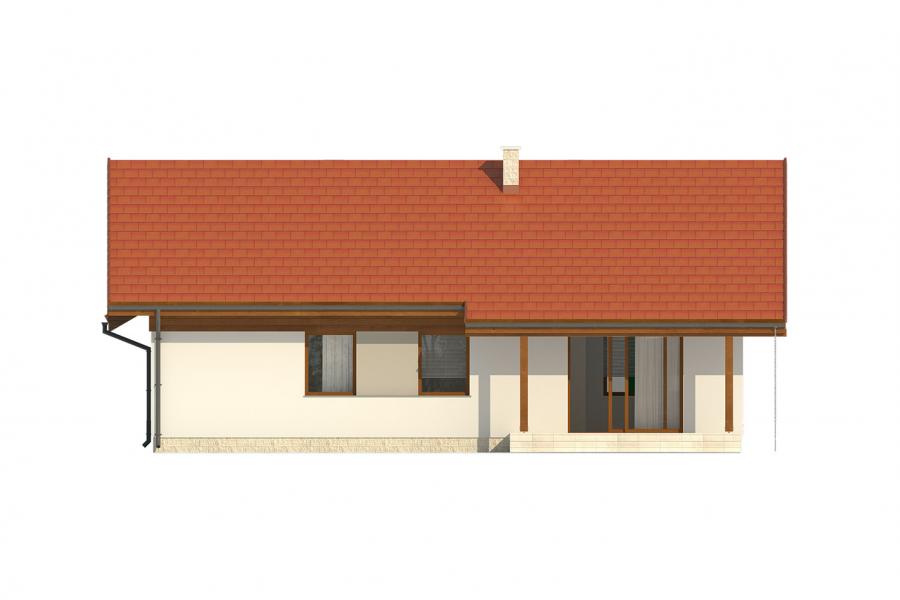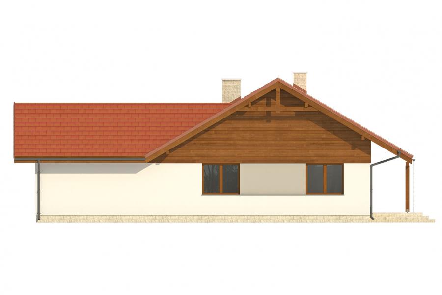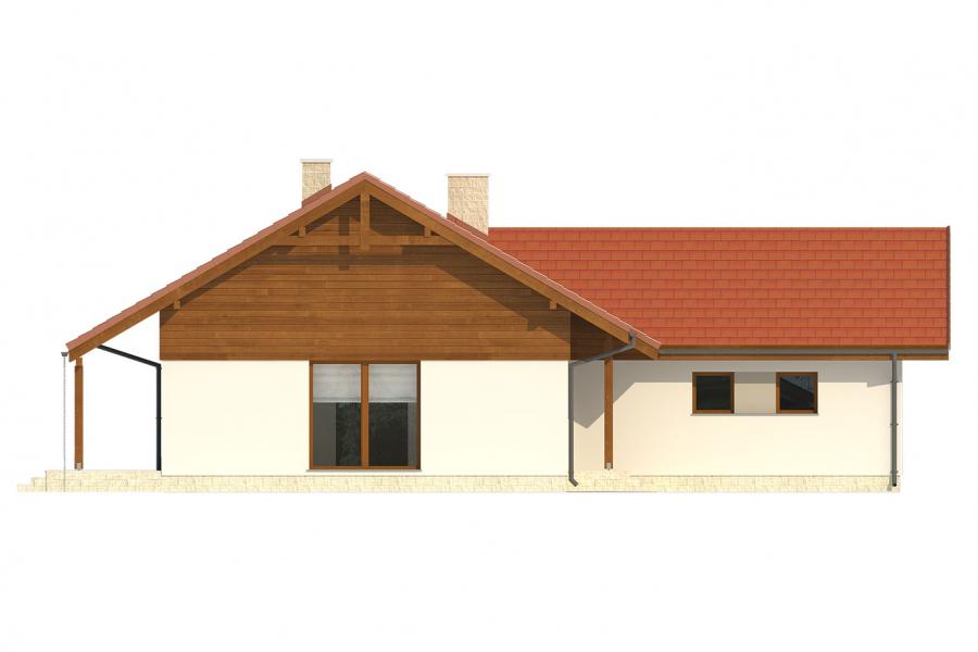 Niewielki jednorodzinny budynek mieszkalny, parterowy, zaprojektowany w technologii szkieletu drewnianego. W swojej niewielkiej formie zawarł wygodny i optymalny układ pomieszczeń zapewniający komfort 4-osobowej rodzinie. Funkcjonalnie rozplanowana przestrzeń została wyraźnie podzielona na część dzienną i nocną. Część reprezentacyjna domu, to przestronny salon połączony z jadalnią, który otwiera się na duży zadaszony taras, kuchnia wzbogacona o spiżarnię oraz wc. Oprócz części reprezentacyjnej, zaprojektowano trzy sypialnie i dużą łazienkę stanowiącą cześć intymną domu oraz dużą kotłownię i dwustanowiskowy garaż w części gospodarczej. Wymiary kotłowni umożliwiają montaż kotła na każdy rodzaj paliwa, w tym na paliwo stałe. Prosta bryła budynku, została przykryta dwuspadowym dachem. Dzięki temu dom jest tani i prosty w budowie oraz niedrogi w utrzymaniu i eksploatacji. Projekt dostępny jest również w technologii murowanej.