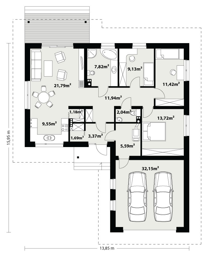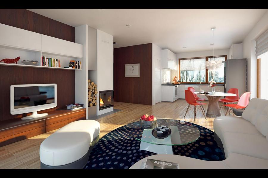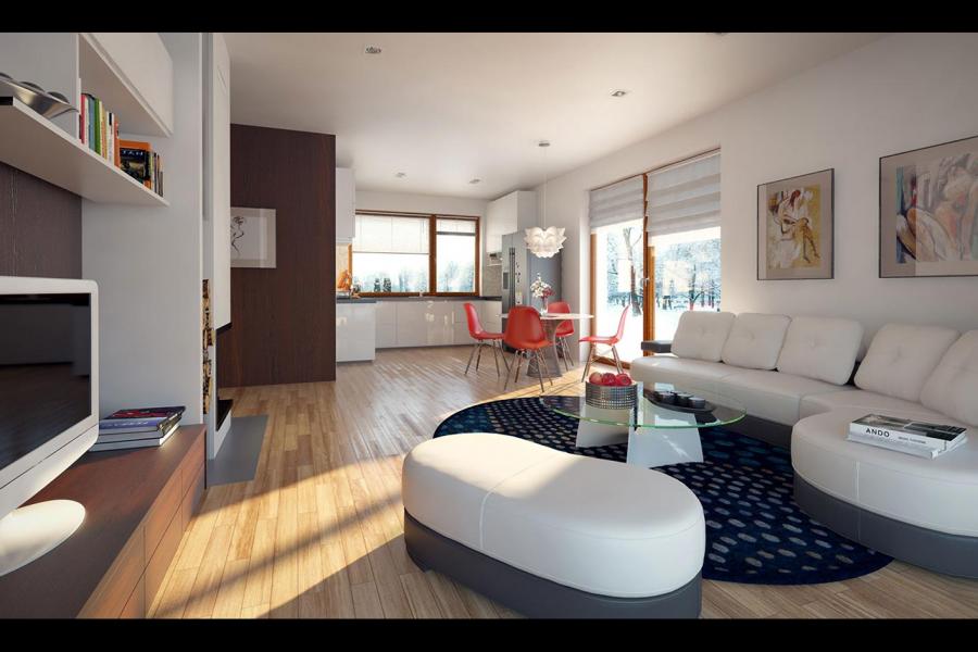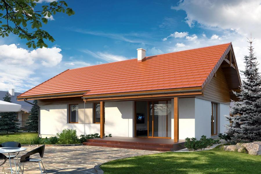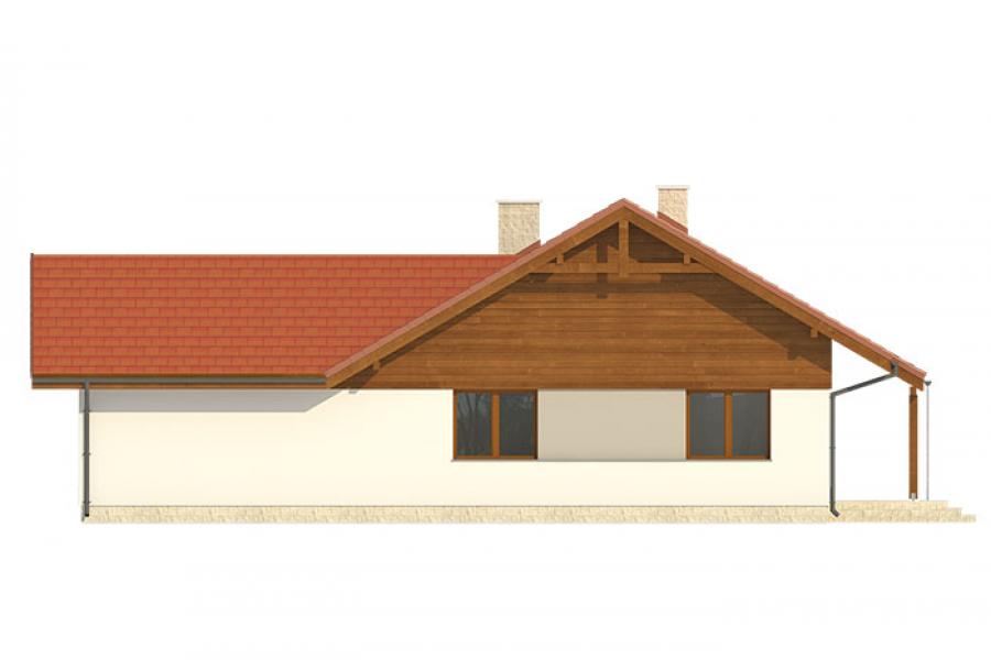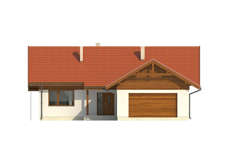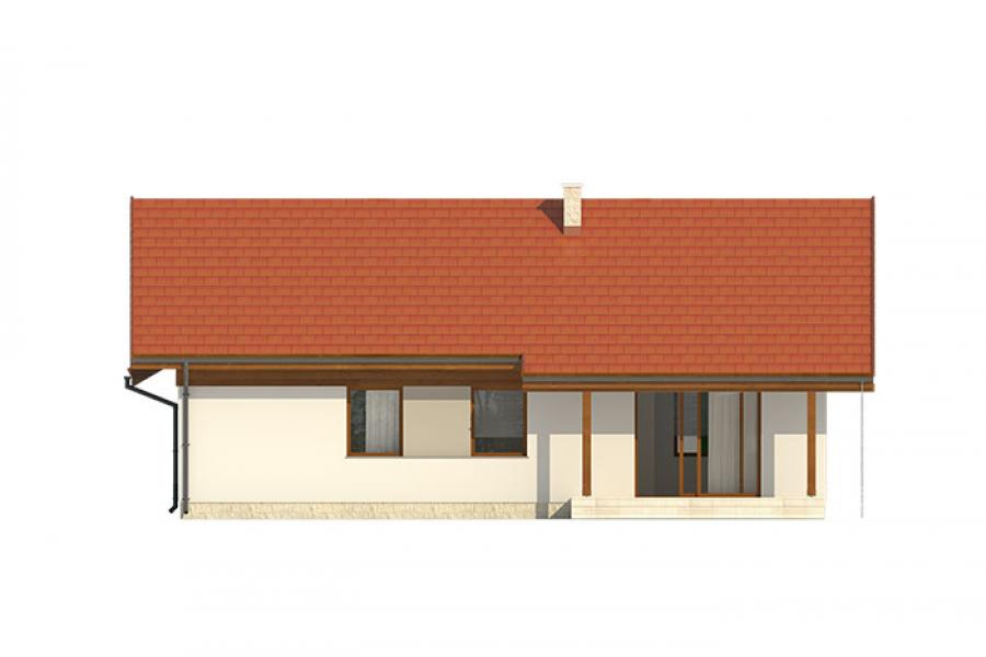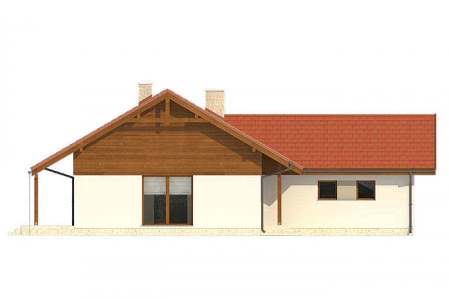 Niewielki jednorodzinny budynek mieszkalny, parterowy, niepodpiwniczony z dwustanowiskowym garażem. W swojej niewielkiej formie zawarł wygodny i optymalny układ pomieszczeń, który zapewni komfort 4-osobowej rodzinie. Funkcjonalnie rozplanowana przestrzeń została wyraźnie podzielona na część dzienną i nocną. Część reprezentacyjna domu, to przestronny salon połączony z jadalnią, który otwiera się na duży zadaszony taras, kuchnia wzbogacona o spiżarnię oraz wc. Oprócz części reprezentacyjnej, zaprojektowano trzy sypialnie i dużą łazienkę stanowiącą cześć intymną domu, oraz dużą kotłownię i dwustanowiskowy garaż w części gospodarczej. Wymiary kotłowni umożliwiają montaż kotła na każdy rodzaj paliwa, w tym na paliwo stałe. Sama bryła budynku nawiązuje do archetypu domu jednorodzinnego. Dom tym samym jest tani i prosty w budowie oraz niedrogi w utrzymaniu i eksploatacji.