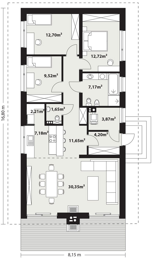Bono 3 to projekt parterowego domu jednorodzinnego zapewniającego optymalne potrzeby 3-4-osobowej rodziny. Jest to dom prosty i zwarty który mieści się na działce 16,15 m szerokości. Przestronna część dzienna to połączenie salonu, jadalni i kuchni, zaś strefa intymna składa się z 3 sypialni i łazienki. Salon z jadalnią ma wysokość 4,2 m oraz duże przeszklone wyjścia na taras. Bryła budynku zamknięta jest na rzucie prostokąta, przykrytego dwuspadowym dachem. Taka forma budynku czyni go prostym w budowie i tanim w eksploatacji.
