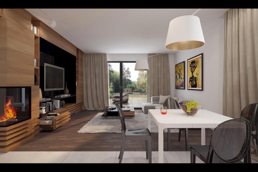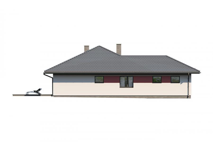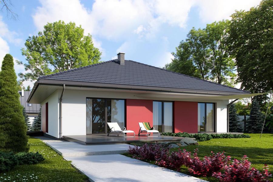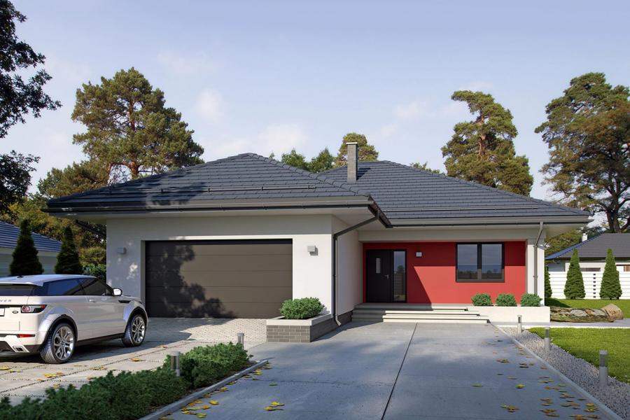 Dom jednorodzinny parterowy, z nieużytkowym poodaszem, z garażem dwustanowiskowym. Prosty i funkcjonalny. Duży salon z jadalnią posiada bezpośrednie wyjście na taras. Kuchnia jest otwarta na salon, można ją jednak bez problemu wydzielić i zamknąć. Dom ten posiada dużo dodatkowego miejsca na szafy i schowki oraz dużą kotłownię dostępną z wiatrołapu. Dwie z trzech sypialni mają własne wyjścia na taras. Wejście do domu jest przez praktyczny podcień chroniący przed deszczem i słońcem.