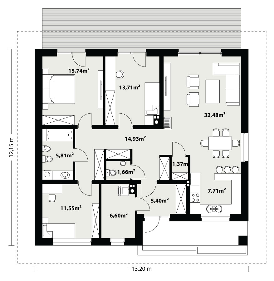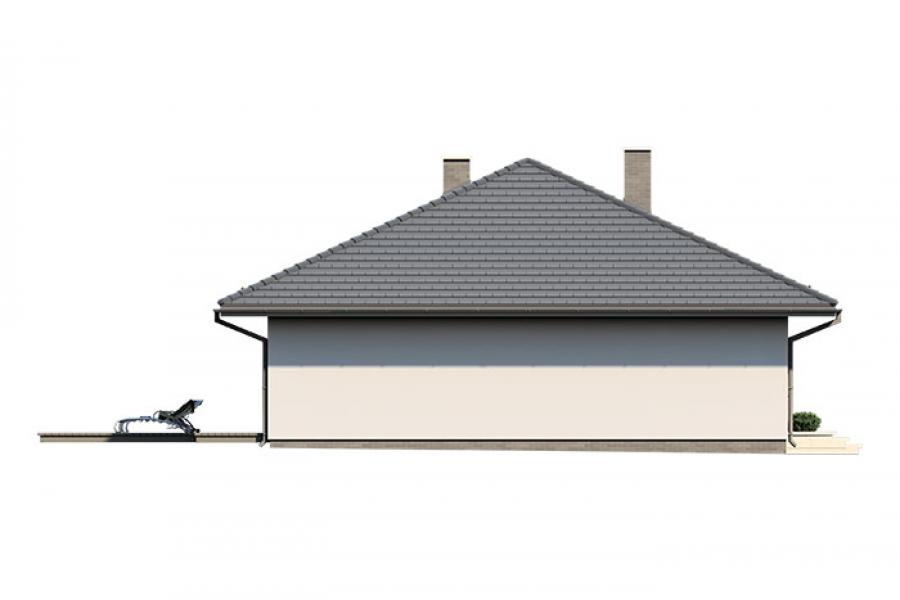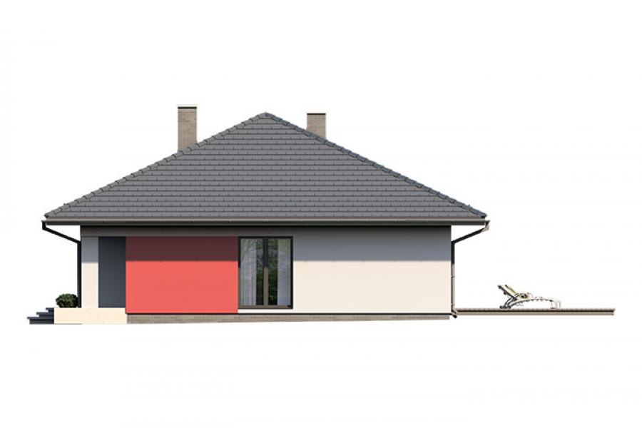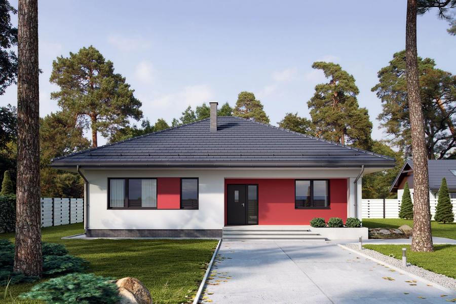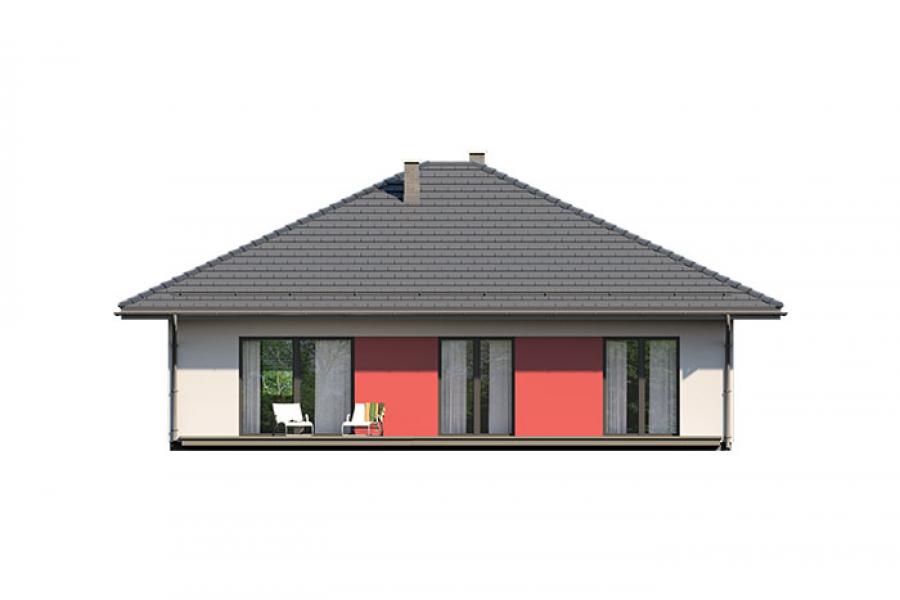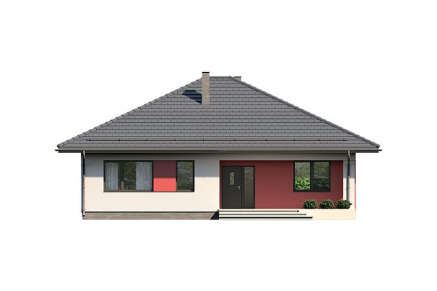 Dom jednorodzinny parterowy, z nieużytkowym poodaszem, bez garażu. Prosty i funkcjonalny. Duży salon z jadalnią posiada bezpośrednie wyjście na taras. Kuchnia jest otwarta na salon, można ją jednak bez problemu wydzielić i zamknąć. Dom ten posiada dużo dodatkowego miejsca na szafy i schowki oraz dużą kotłownię dostępną z wiatrołapu. Dwie z trzech sypialni mają własne wyjścia na taras. Wejście do domu jest przez praktyczny podcień chroniący przed deszczem i słońcem.