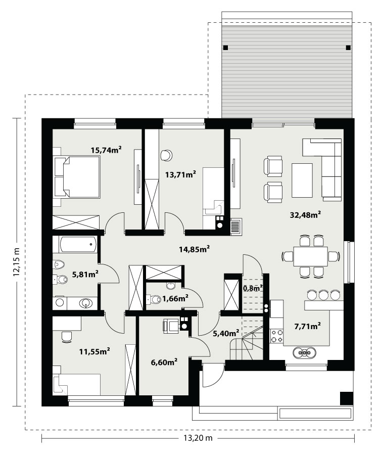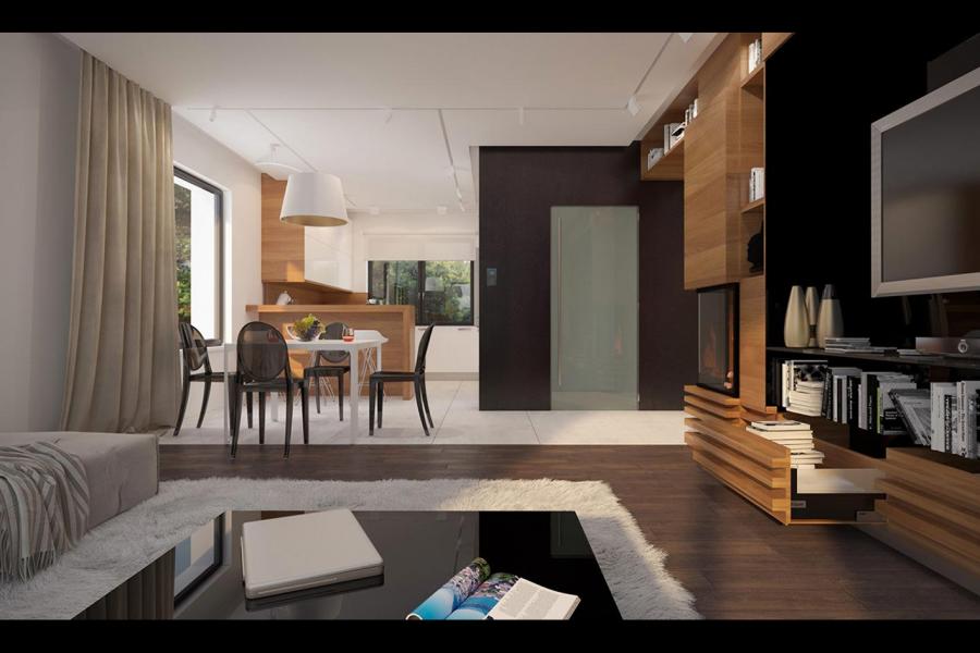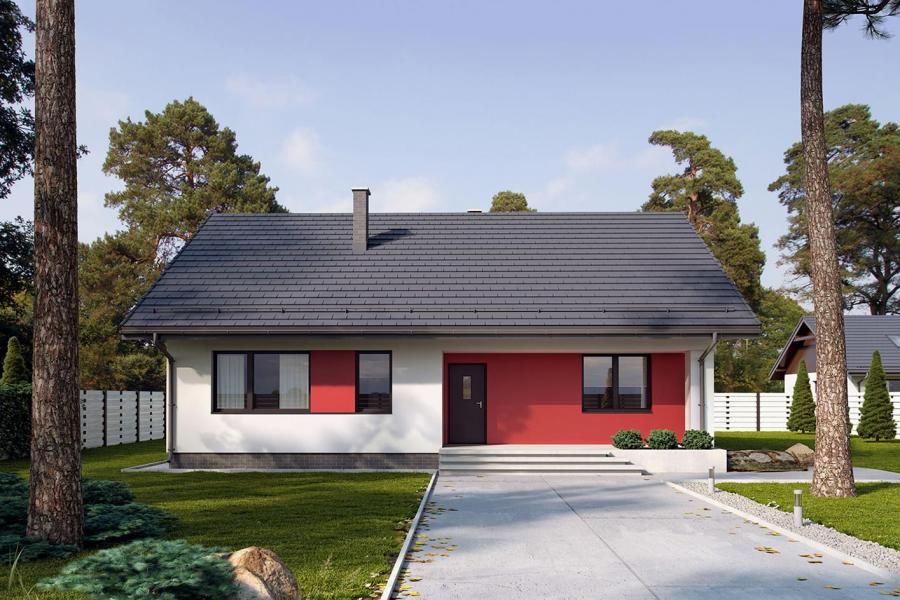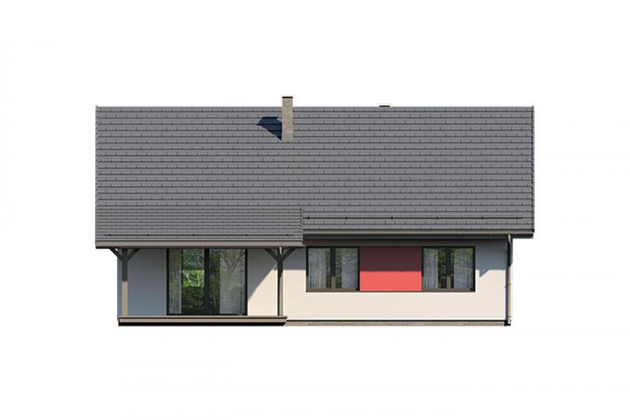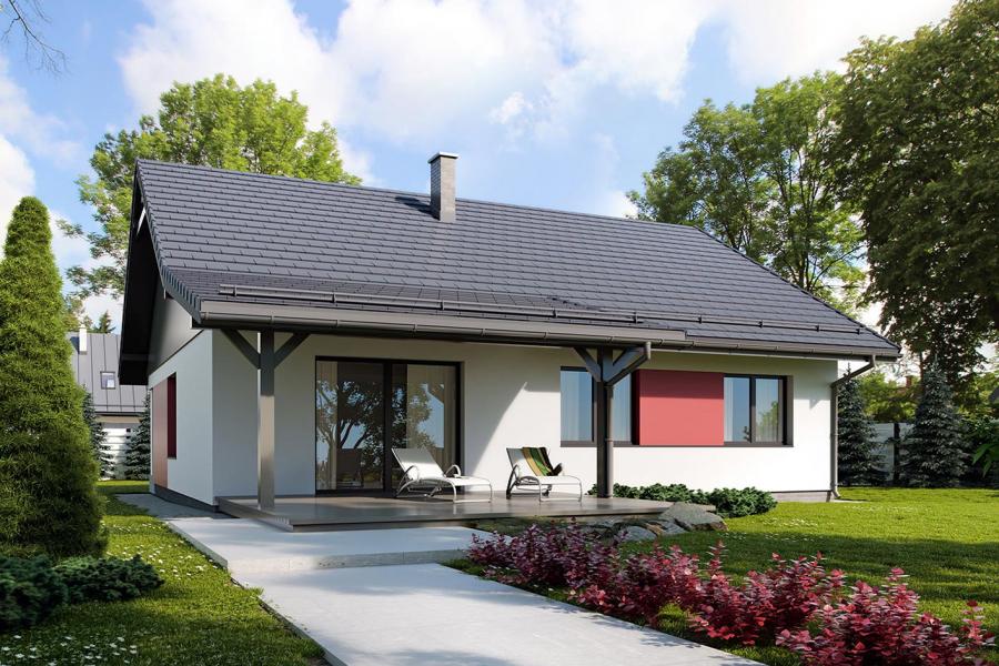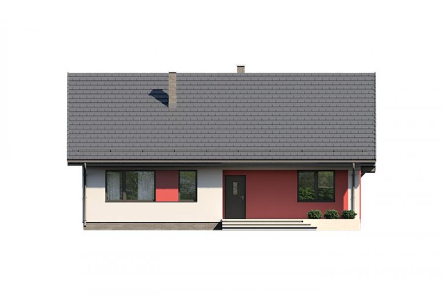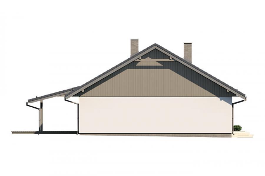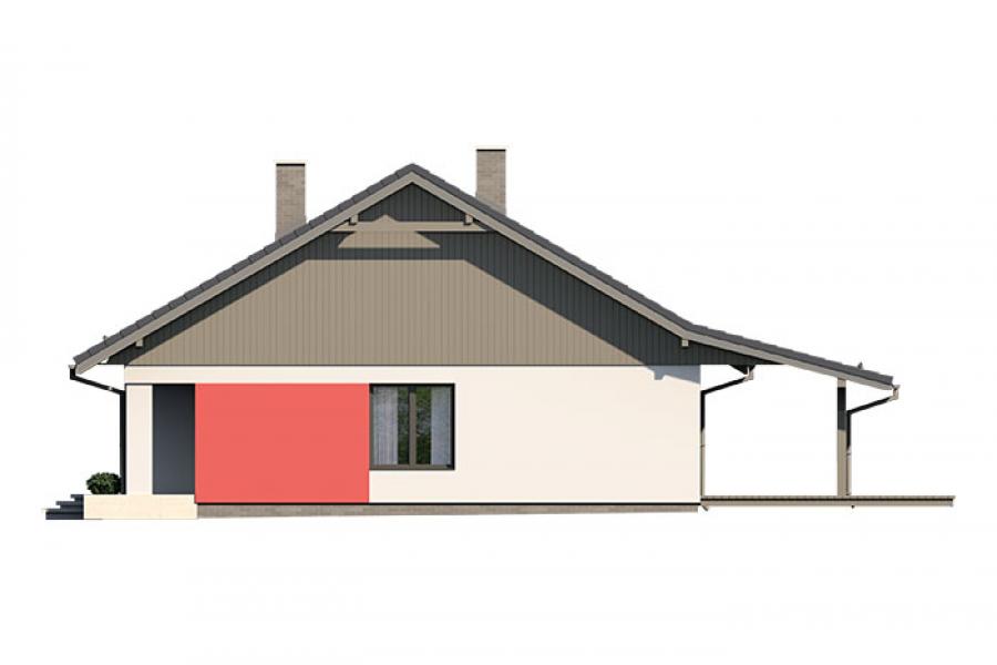 Dom jednorodzinny parterowy, z nieużytkowym poodaszem, bez garażu. Prosty i funkcjonalny. Duży salon z jadalnią posiada bezpośrednie wyjście na zadaszony taras. Kuchnia jest otwarta na salon, można ją jednak bez problemu wydzielić i zamknąć. Dom ten posiada dużo dodatkowego miejsca na szafy i schowki oraz dużą kotłownię dostępną z wiatrołapu. Wejście do domu jest przez praktyczny podcień chroniący przed deszczem i słońcem. Strych (nieużytkowy) posiada wejście ze schodami dostępnymi z wiatrołapu. Można go zaadaptować na dodatkowe pokoje, mieszkanie czy biuro.