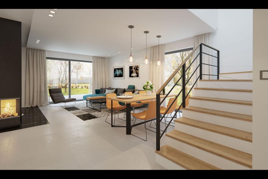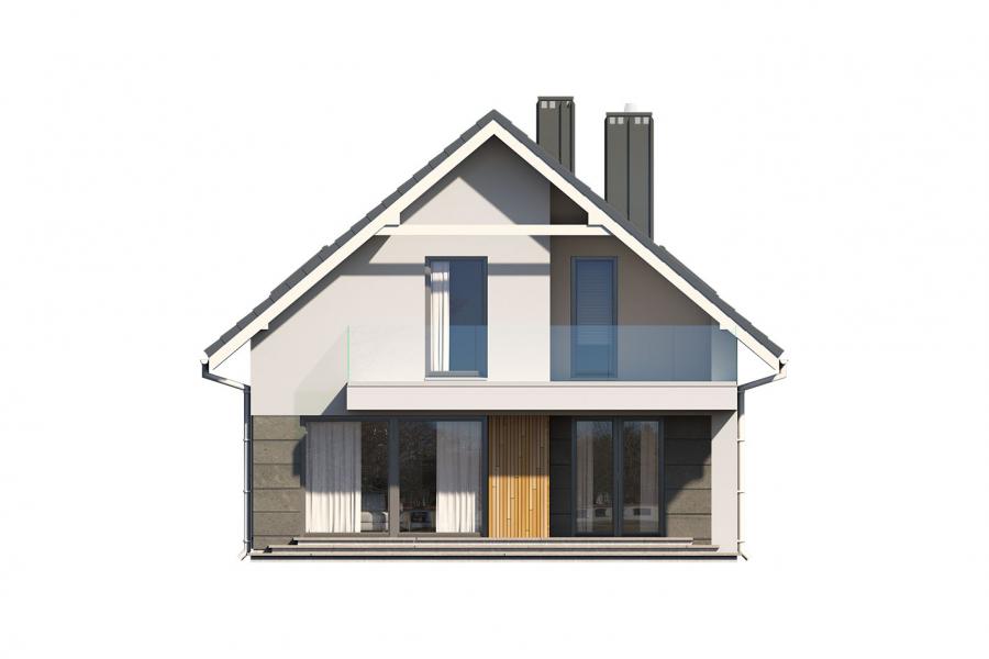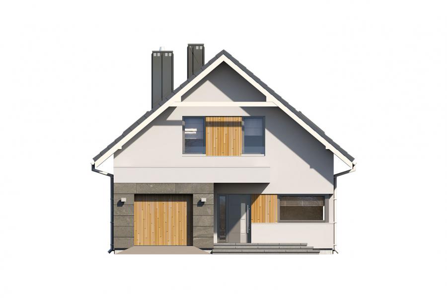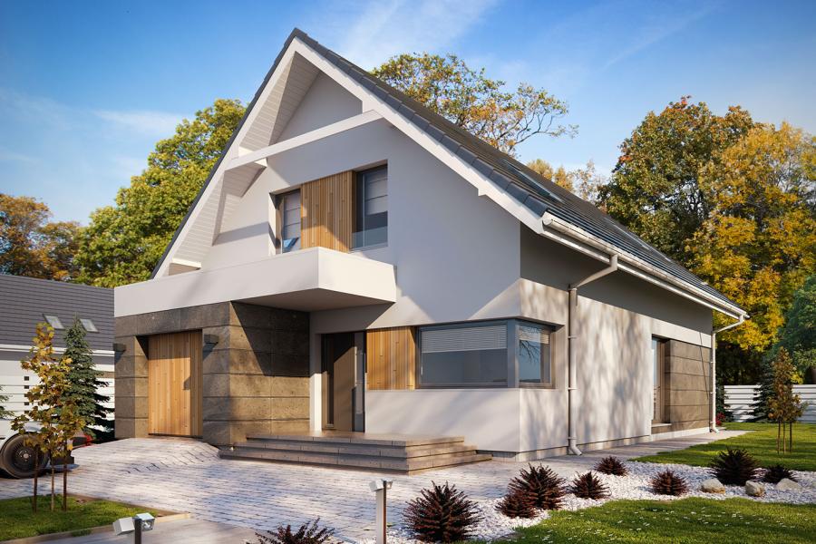 Dana 2 to jednorodzinny budynek mieszkalny, parterowy z użytkowym poddaszem i jednostanowiskowym garażem. Projekt charakteryzuje się prostą bryłą z dwuspadowym dachem, co czyni go niedrogim w budowie i tanim w eksploatacji. Biały tynk na elewacji został urozmaicony drewnianą szalówką i szarym kamieniem, który dobrze współgra ze stolarką w tym samym odcieniu. Grafitowa płaska dachówka, szklane balustrady, biała podsufitka nadają budynkowi nowoczesnego charakteru. Ergonomicznie zaprojektowana i wyraźnie podzielona przestrzeń mieszkalna składa się ze strefy dziennej, nocnej i gospodarczej. Najbardziej reprezentacyjna część domu, to przestronny salon połączony z jadalnią i kuchnią dostępną z tarasu. Oprócz części dziennej przewidziano na parterze dodatkowy pokój, który można wykorzystać na gabinet lub kolejną sypialnię. Na poddaszu przewidziano 3 sypialnie, łazienkę i pralnię. Największa sypialnia ma dodatkowo własną łazienkę i garderobę. Dużą kotłownię, na każdy rodzaj paliwa oraz jednostanowiskowy garaż zlokalizowano w części gospodarczej domu.