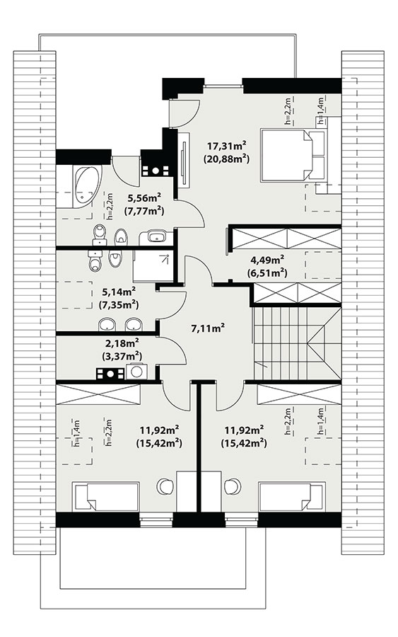 | Powierzchnia użytkowaDla domów parterowych: Suma powierzchni użytkowych wszystkich pomieszczeń bez garażu. Dla domów z poddaszem (dach spadzisty): Suma powierzchni użytkowych wszystkich pomieszczeń bez garażu i strychu. Na poddaszu, pod skosami dachu powierzchnię użytkową liczono wg zasady: - powyżej 2,2m wysokości pomieszczenia powierzchnia liczona w 100%, - pomiędzy 1,4m a 2,2m w 50%, - poniżej 1,4m powierzchnia nie jest brana pod uwagę. | 137.99 m² |