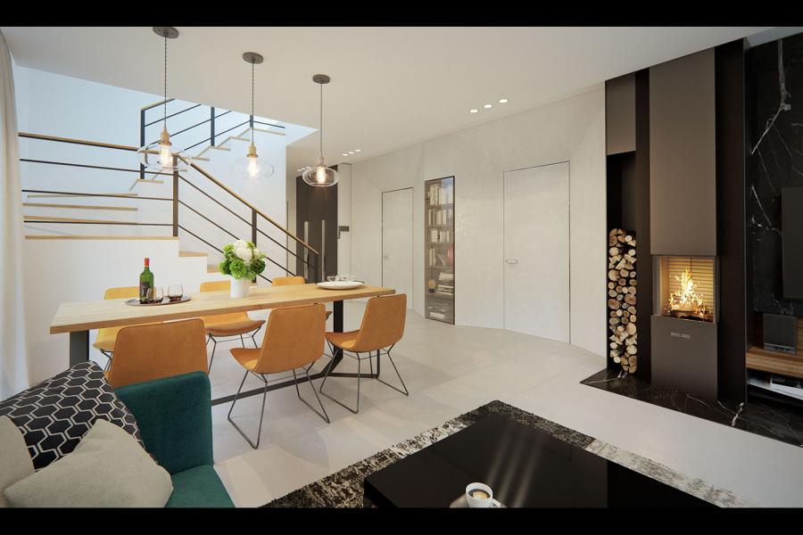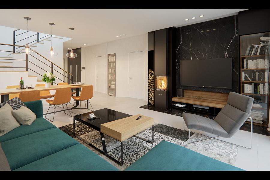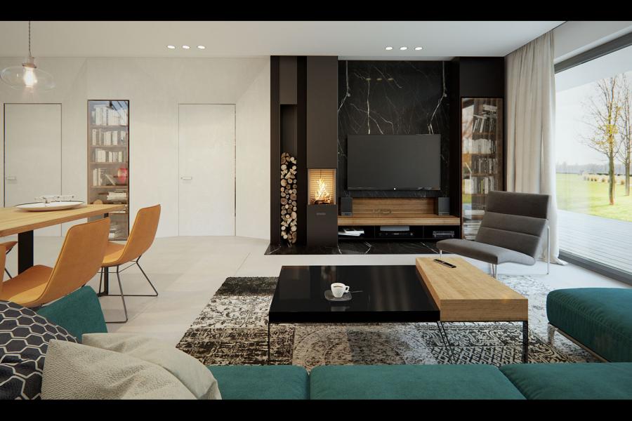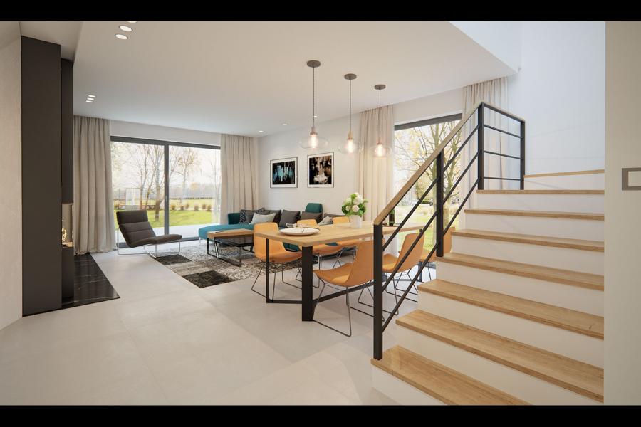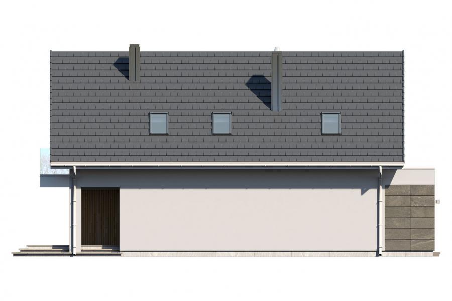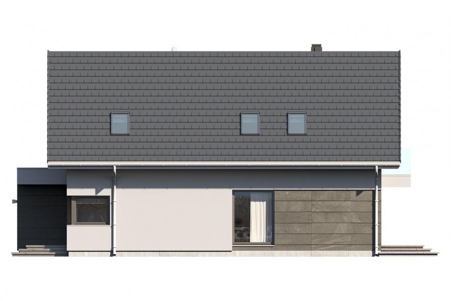 Dana to jednorodzinny budynek mieszkalny, parterowy z użytkowym poddaszem i jednostanowiskowym garażem. Projekt charakteryzuje się prostą bryłą z dwuspadowym dachem, co czyni go niedrogim w budowie i tanim w eksploatacji. Biały tynk na elewacji został urozmaicony drewnianą szalówką i szarym kamieniem, który dobrze współgra ze stolarką w tym samym odcieniu. Grafitowa płaska dachówka, szklane balustrady, biała podsufitka nadają budynkowi nowoczesnego charakteru. Ergonomicznie zaprojektowana i wyraźnie podzielona przestrzeń mieszkalna składa się ze strefy dziennej, nocnej i gospodarczej. Najbardziej reprezentacyjna część domu, to przestronny salon połączony z jadalnią, który otwiera się na duży taras oraz kuchnia ze spiżarnią i łazienką. Oprócz części dziennej przewidziano na parterze dodatkowy pokój, który można wykorzystać na gabinet lub kolejną sypialnię. Na poddaszu przewidziano 3 sypialnie, łazienkę i pralnię. Największa sypialnia ma dodatkowo własną łazienkę i garderobę. Dużą kotłownię, na każdy rodzaj paliwa oraz jednostanowiskowy garaż zlokalizowano w części gospodarczej domu.