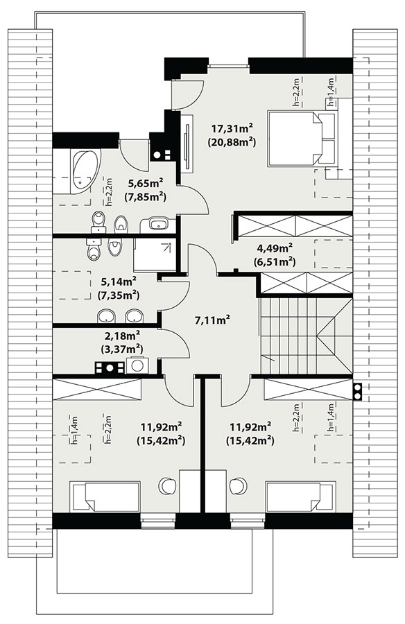 | Powierzchnia użytkowaDla domów parterowych: Suma powierzchni użytkowych wszystkich pomieszczeń bez garażu. Dla domów z poddaszem (dach spadzisty): Suma powierzchni użytkowych wszystkich pomieszczeń bez garażu i strychu. Na poddaszu, pod skosami dachu powierzchnię użytkową liczono wg zasady: - powyżej 2,2m wysokości pomieszczenia powierzchnia liczona w 100%, - pomiędzy 1,4m a 2,2m w 50%, - poniżej 1,4m powierzchnia nie jest brana pod uwagę. | 138.14 m² |