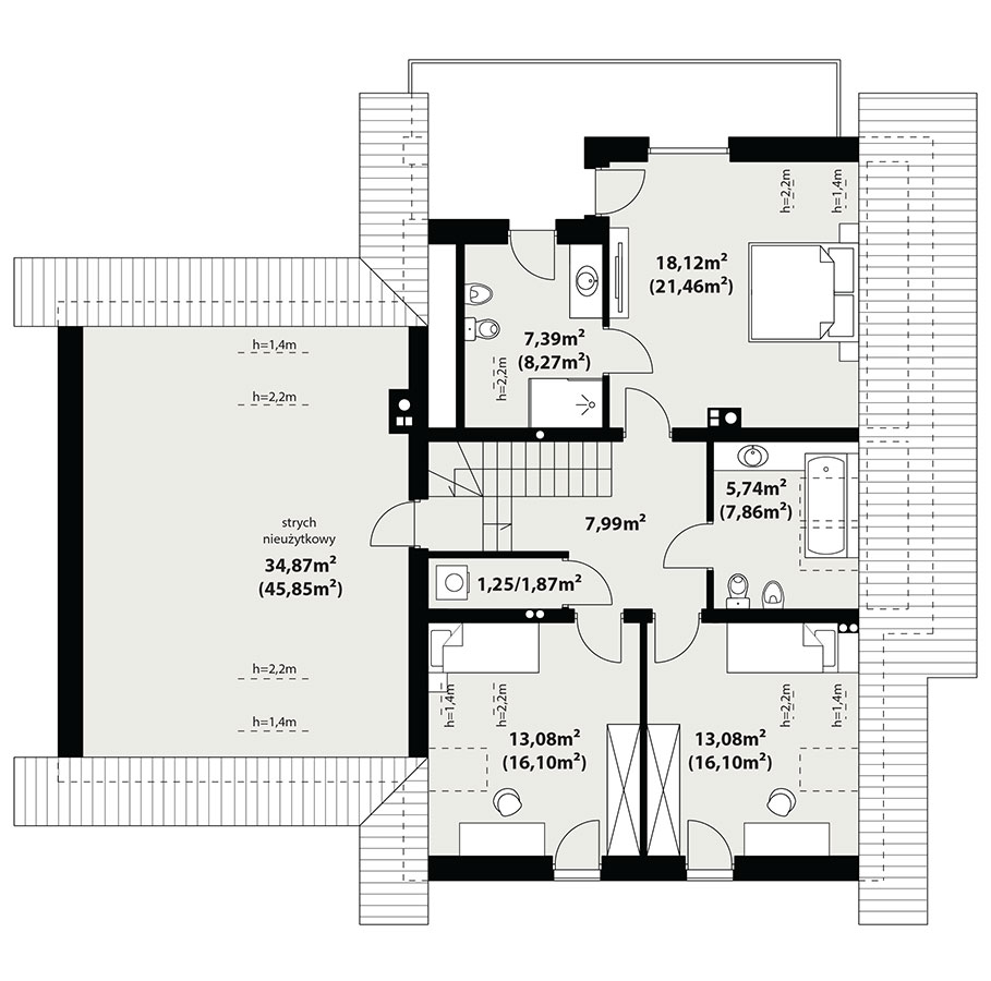 | Powierzchnia użytkowaDla domów parterowych: Suma powierzchni użytkowych wszystkich pomieszczeń bez garażu. Dla domów z poddaszem (dach spadzisty): Suma powierzchni użytkowych wszystkich pomieszczeń bez garażu i strychu. Na poddaszu, pod skosami dachu powierzchnię użytkową liczono wg zasady: - powyżej 2,2m wysokości pomieszczenia powierzchnia liczona w 100%, - pomiędzy 1,4m a 2,2m w 50%, - poniżej 1,4m powierzchnia nie jest brana pod uwagę. | 163.70 m² |