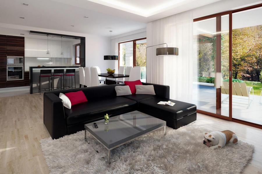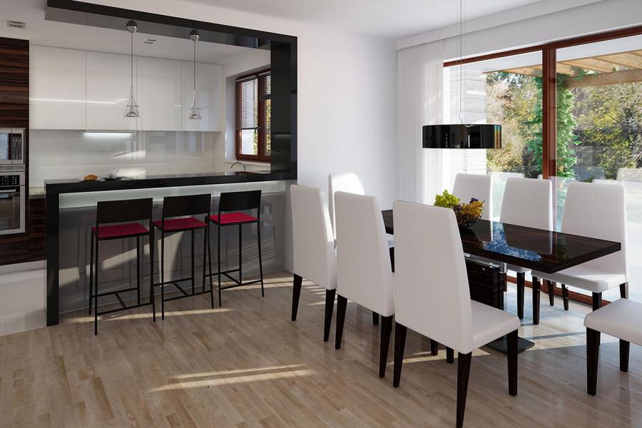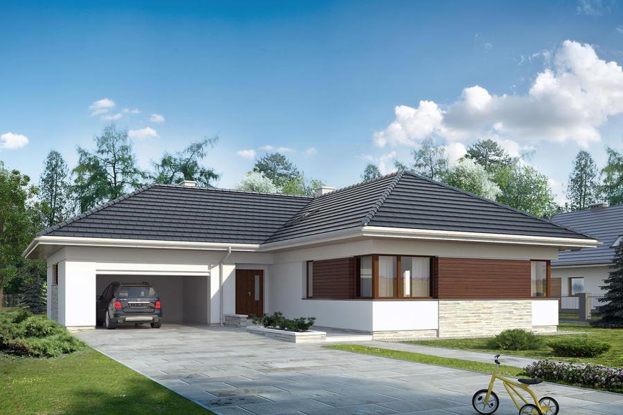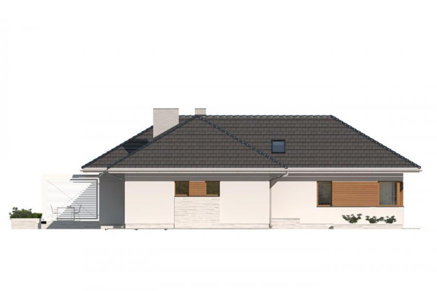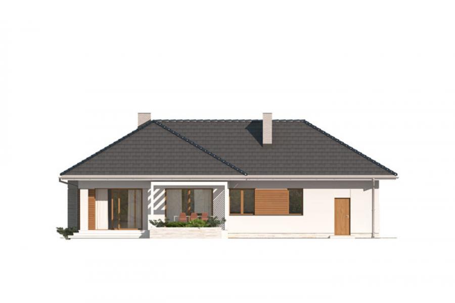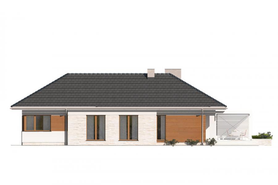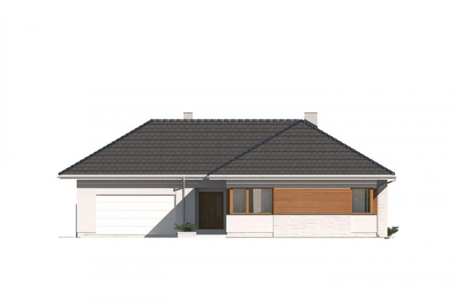 Dom jednorodzinny, parterowy, niepodpiwniczony, z dwustanowiskowym garażem. Wygodny, z przestronną i otwartą częścią dzienną oraz wydzieloną częścią nocną z czterema sypialniami i łazienką. Zastosowano schody na strych nieużytkowy który można zaadaptować na pokoje lub pozostawić otwartą przestrzeń przeznaczoną na suszarnię, pokój hobby itp. Dom posiada duże przeszklenia w salonie i jadalni z wyjściami na zadaszony taras. Kominek w salonie jest zgrabnie schowany w ścianę przez co nie pomniejsza go. W domu przewidziano wiele miejsca na szafy i schowki. Duża kotłownia oraz pomieszczenie na skład opału pozwola na montaż kotła na dowolny rodzaj paliwa.