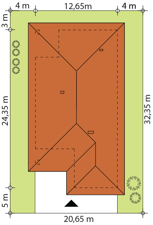 | Powierzchnia zabudowyPowierzchnia terenu, zajęta przez budynek w stanie wykończonym, bez tarasów, schodów zewnętrznych i podjazdów (PN-ISO 9836: 1997) | 256.9 m² |