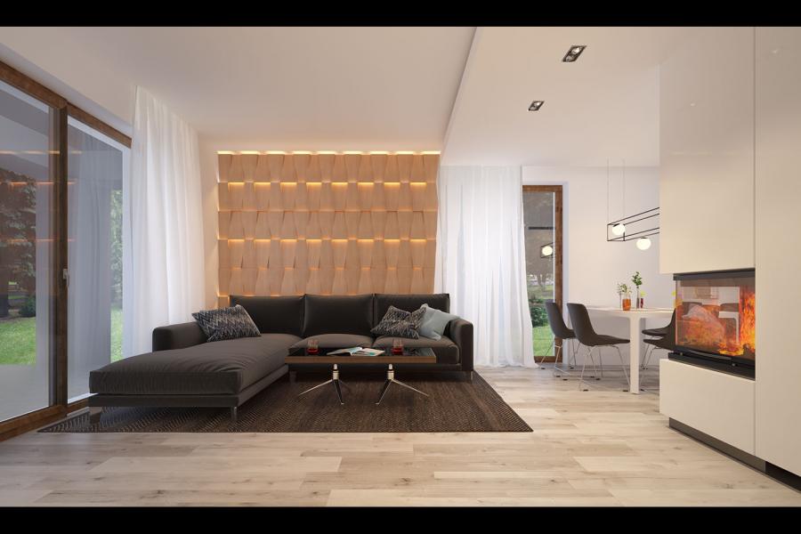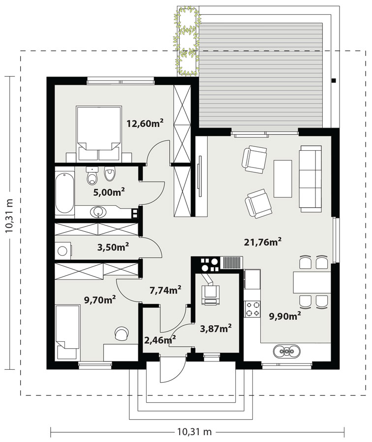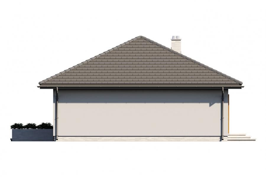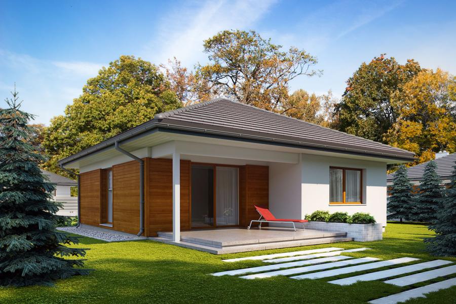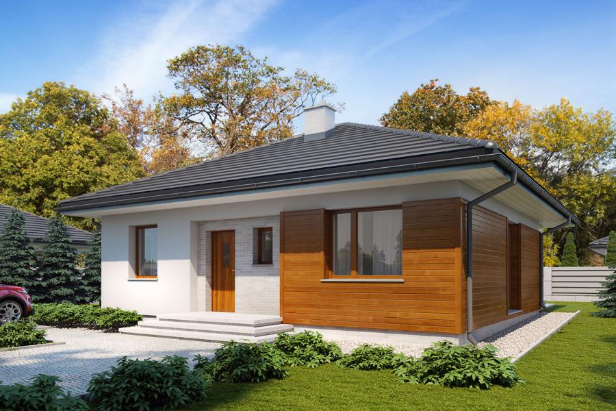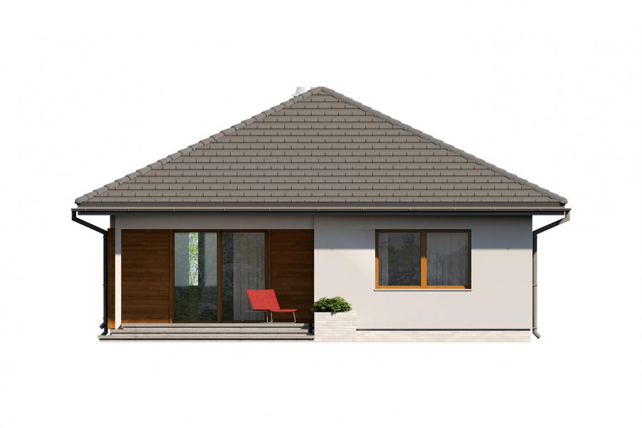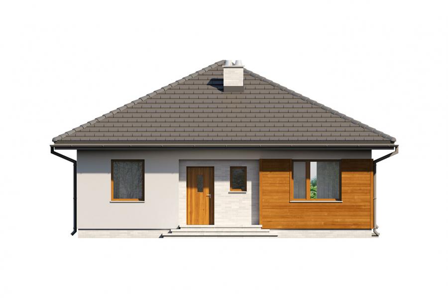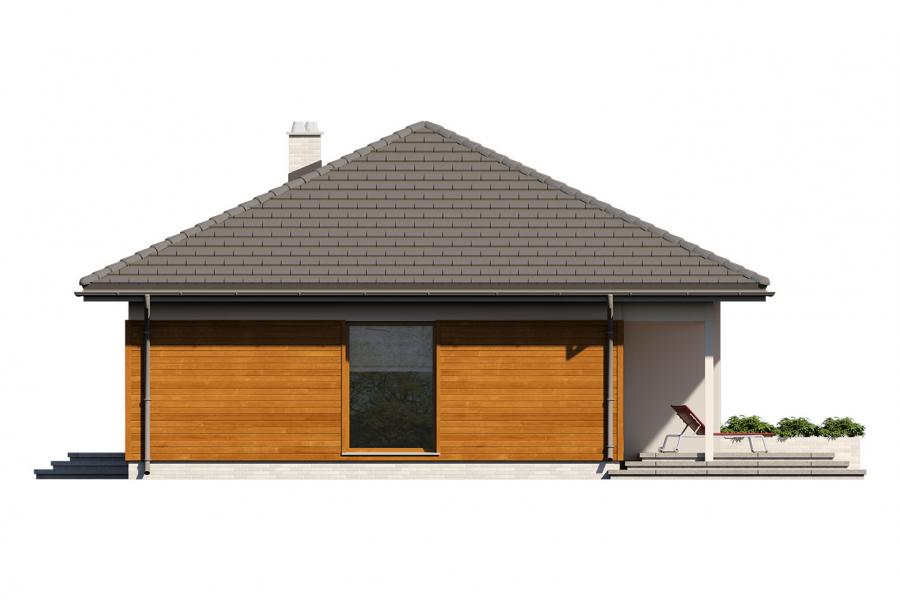 Elsa drewniana to projekt parterowego domu jednorodzinnego zapewniającego optymalne potrzeby 3-4-osobowej rodziny. Jest to dom bardzo funkcjonalny z wyraźnym podziałem na strefy. Przestronna część dzienna to proste i klasyczne połączenie salonu, jadalni i kuchni, zaś strefa intymna składa się z 2 sypialni i łazienki. Plusem projektu jest dodatkowe pomieszczenie gospodarcze, które można przeznaczyć na pralnię lub spiżarnię. Dom posiada duży taras umożliwiający spędzanie czasu na świeżym powietrzu niezależnie od warunków pogodowych. Wejście do domu jest przez niewielki podcień chroniący przed deszczem i słońcem. Z samego wiatrołapu prowadzi wejście do dużej kotłowni na każdy rodzaj paliwa. Bryła budynku zamknięta jest na rzucie kwadratu, przykrytego czterospadowym dachem. Taka forma budynku czyni go prostym w budowie i tanim w eksploatacji.