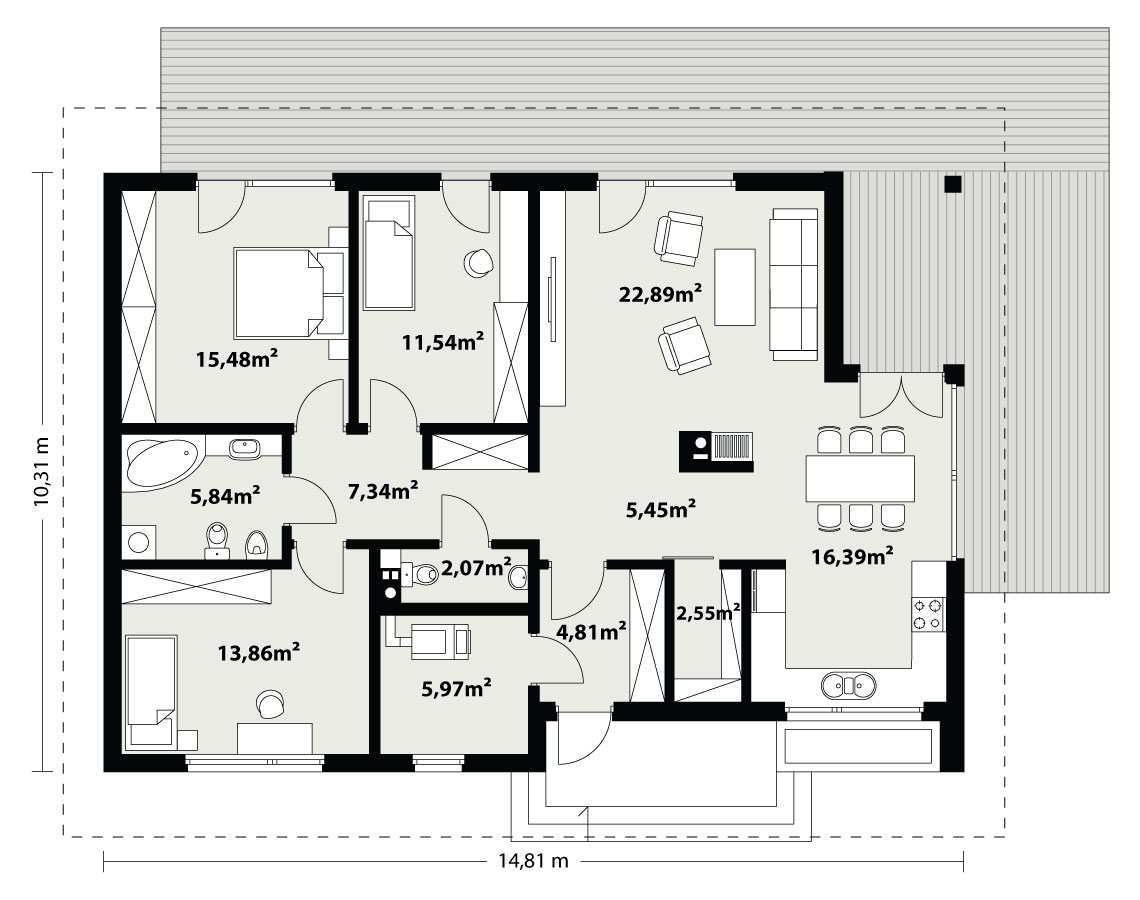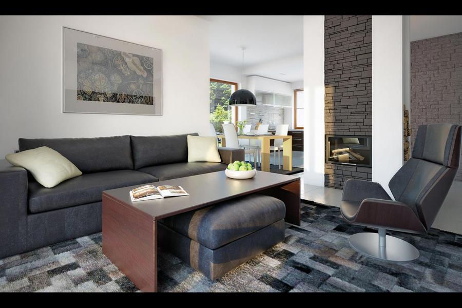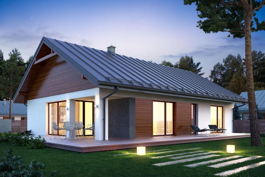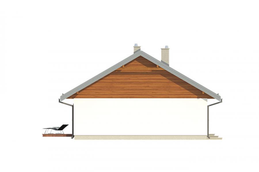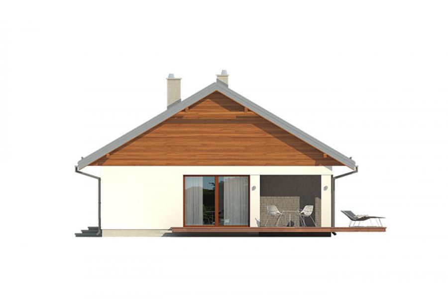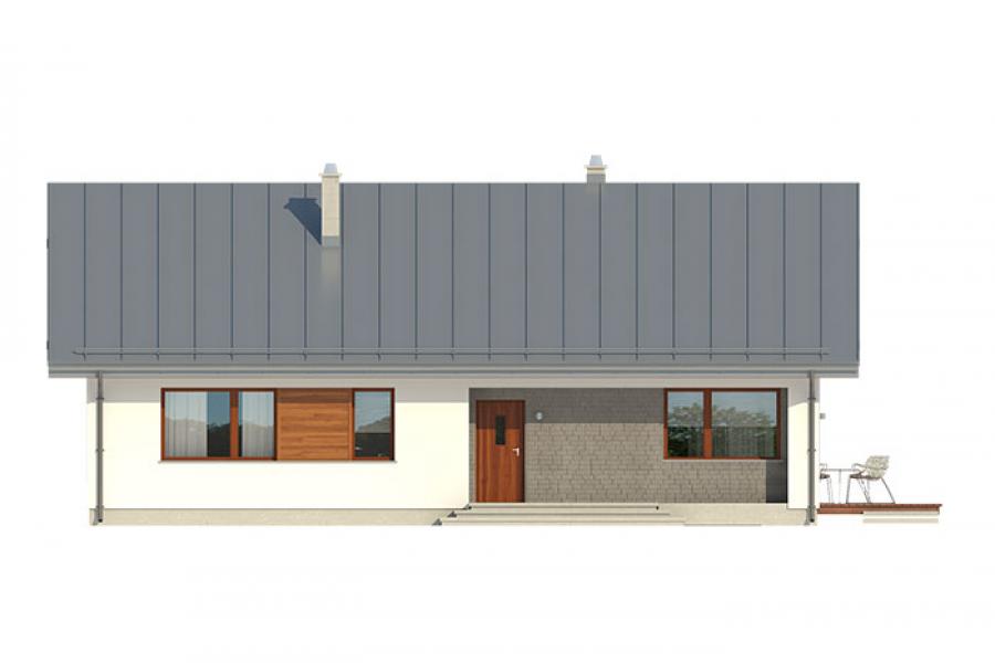 Parterowy dom jednorodzinny, niepodpiwniczony, zaprojektowany w technologii szkieletu drewnianego. Łączy w sobie nowoczesny charakter elewacji z prostym, klasycznym układem pomieszczeń. Jest to bardzo wygodny , prosty i funkcjonalny dom, który swoim pełnym programem zapewnia optymalny komfort 4-osobowej rodzinie. Przestronna część dzienna to duży salon, jadalnia otwierająca się na ogród poprzez ogromne przeszklenie, kuchnia ze spiżarnią oraz wc. Atutem projektu jest zadaszony taras. Tak zaproponowany, ciekawy i przestronny układ pomieszczeń umożliwia szereg aranżacji. Część nocna to 3 wygodne sypialnie, z czego dwie posiadają wyjście na taras oraz przestronna łazienka. W domu zaprojektowano dużą kotłownię dostępną z wiatrołapu, której parametry pozwalają na montaż kotła na każdy rodzaj paliwa, w tym na paliwo stałe. Ten optymalny i ciekawy program funkcjonalny został ujęty w prostej bryle na rzucie prostokąta, przykrytej dwuspadowym dachem. Atutem projektu jest jego prostota zarówno w układzie pomieszczeń jak i w rozwiązaniach elewacji, gdzie elegancki, nowoczesny styl osiągnięto poprzez klasyczne, proste ale szlachetne materiały oraz delikatny, subtelny detal.