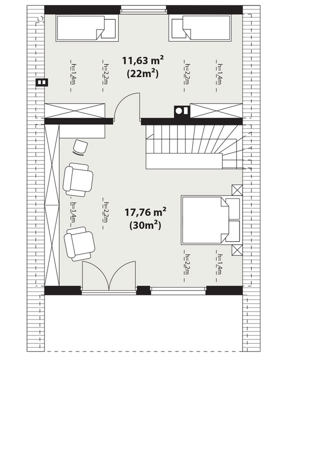 | Powierzchnia użytkowaDla domów parterowych: Suma powierzchni użytkowych wszystkich pomieszczeń bez garażu. Dla domów z poddaszem (dach spadzisty): Suma powierzchni użytkowych wszystkich pomieszczeń bez garażu i strychu. Na poddaszu, pod skosami dachu powierzchnię użytkową liczono wg zasady: - powyżej 2,2m wysokości pomieszczenia powierzchnia liczona w 100%, - pomiędzy 1,4m a 2,2m w 50%, - poniżej 1,4m powierzchnia nie jest brana pod uwagę. | 85.68 m² |