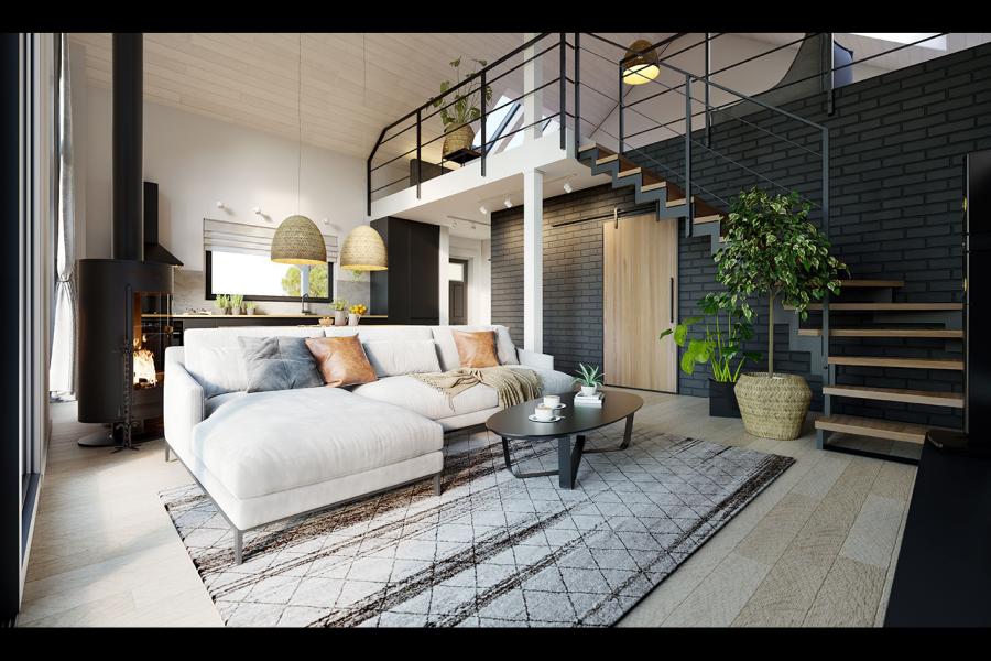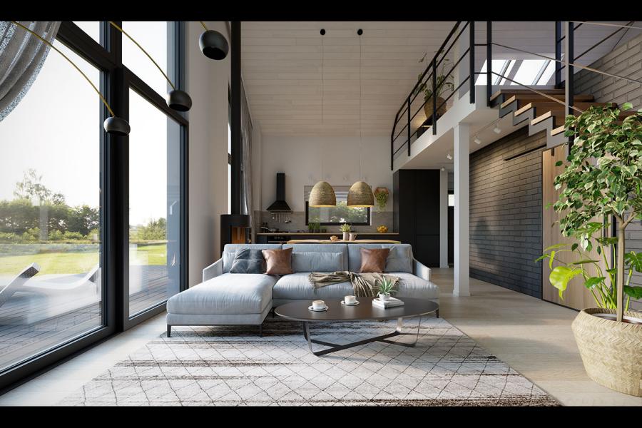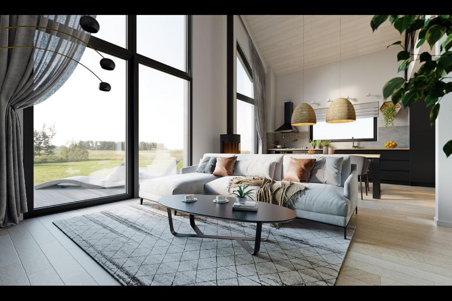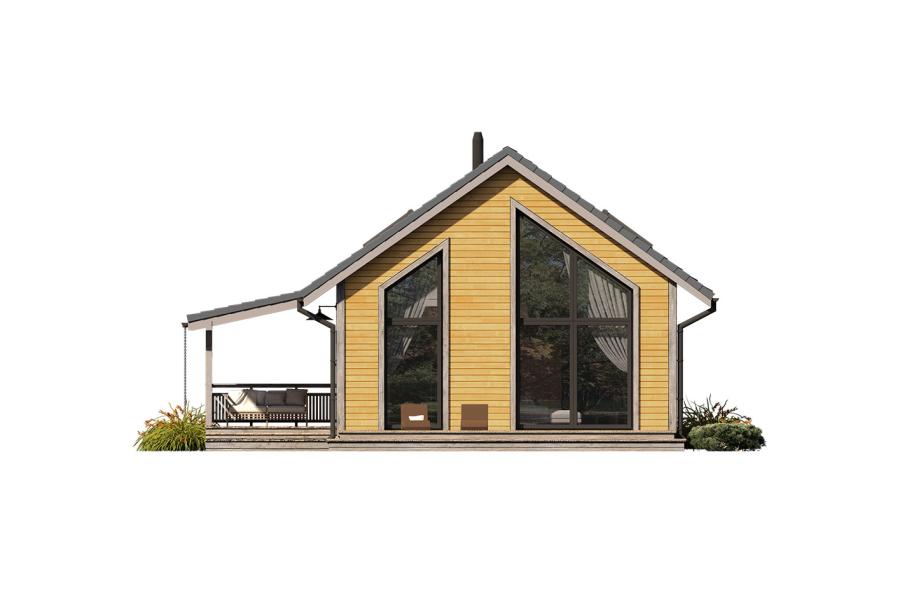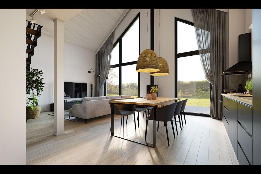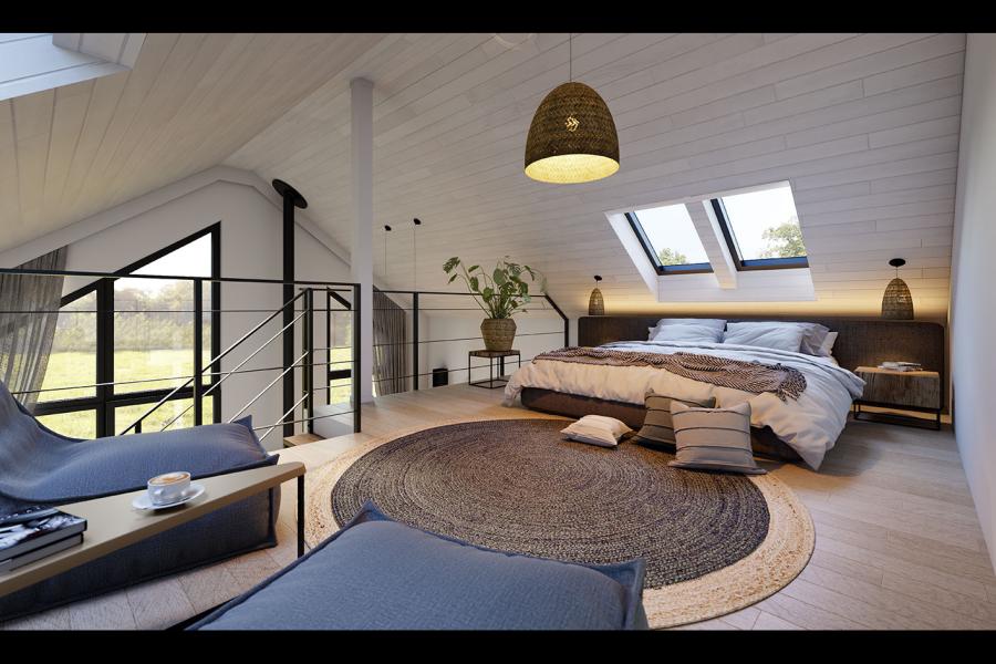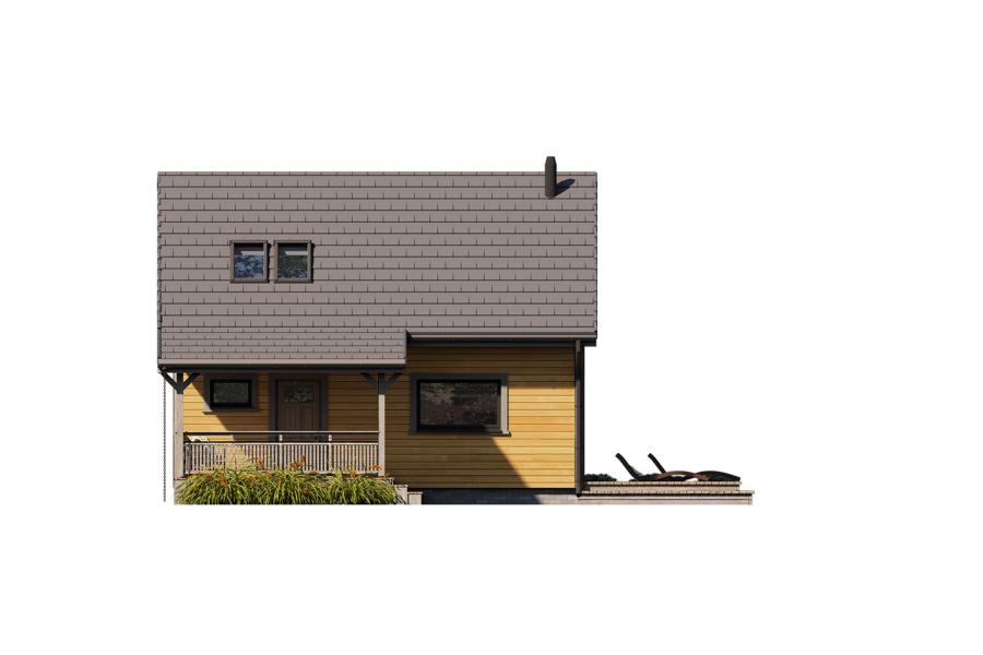 Erna 3 drewniana to niewielki dom jednorodzinny lub letniskowy. Posiada sypialnię na parterze oraz otwartą część dzienną z antresolą na której jest dodatkowa przestrzeń do dowolnej aranżacji. Dzięki powierzchni zabudowy 69,5 m2, może być budowany na zgłoszenie. Dom posiada duże przeszklenie w ścianie szczytowej a wejście jest przez zadaszony taras z boku domu co pozwala sytuować dom również na działkach z wejściem od południa. Standardowo dom wyposażony jest w pompę ciepła oraz kominek.