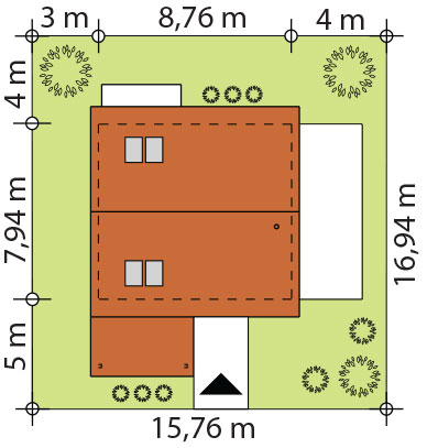 | Powierzchnia zabudowyPowierzchnia terenu, zajęta przez budynek w stanie wykończonym, bez tarasów, schodów zewnętrznych i podjazdów (PN-ISO 9836: 1997) | 69.55 m² |