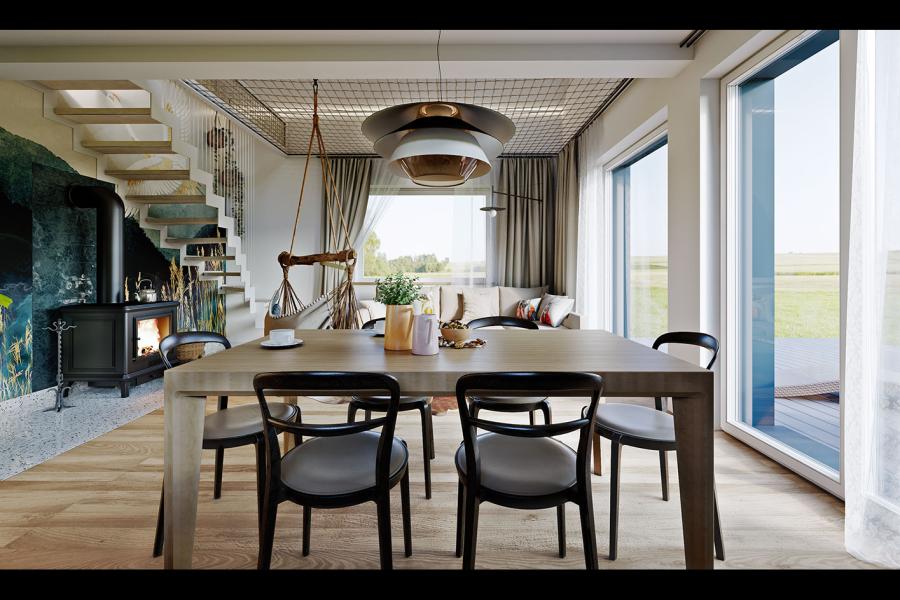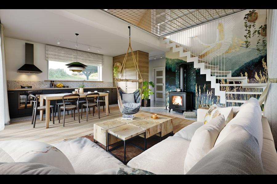 Sercem domu jest otwarta i doskonale doświetlona strefa dzienna o powierzchni ponad 28 m². Duże przeszklenia nie tylko optycznie powiększają wnętrze, ale stanowią naturalne przedłużenie salonu na taras, pozwalając przyrodzie „wejść” do środka. Klimat wnętrza buduje wolnostojący piecyk typu „koza” oraz unikalna antresola. Zastosowanie nad salonem ażurowej siatki zamiast pełnego stropu to aranżacyjny majstersztyk – tworzy ona dodatkową strefę relaksu (np. do czytania książek), nie ograniczając przy tym poczucia przestronności.