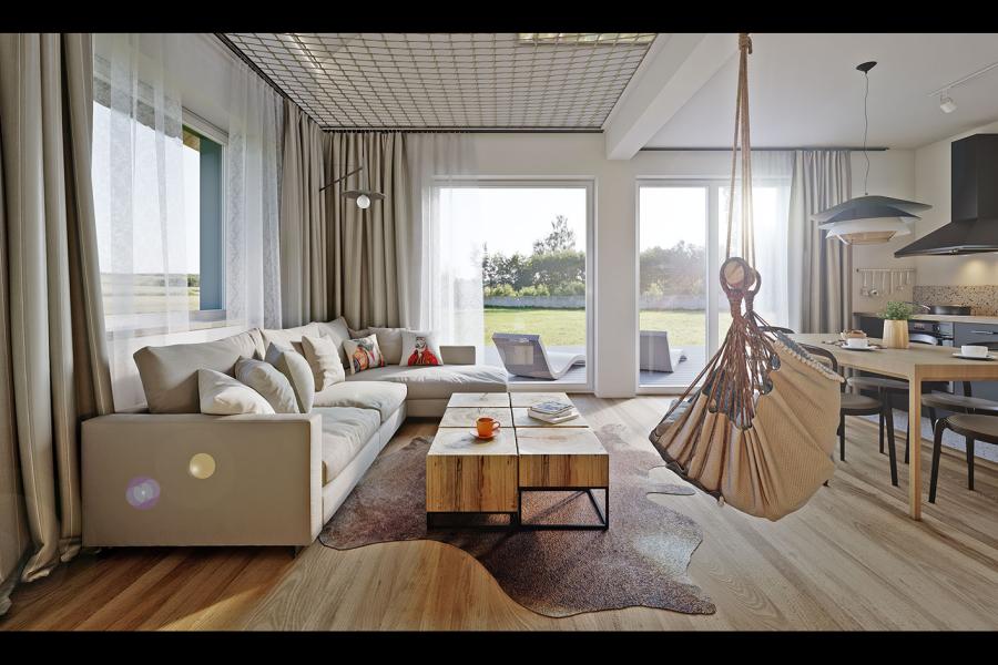 - Harmonia z naturą: Liczne wyjścia tarasowe z salonu oraz sypialni pozwalają na swobodną komunikację z ogrodem.