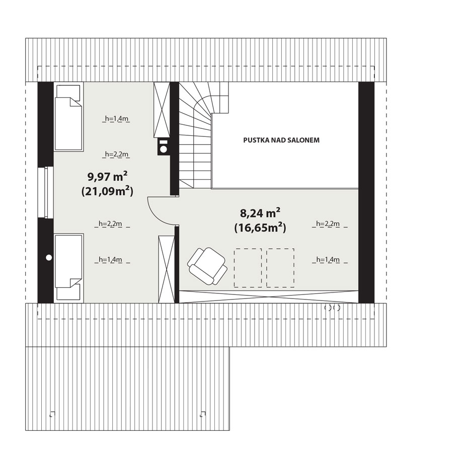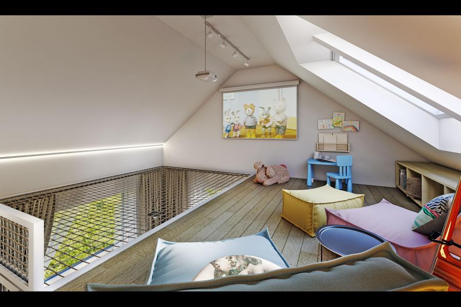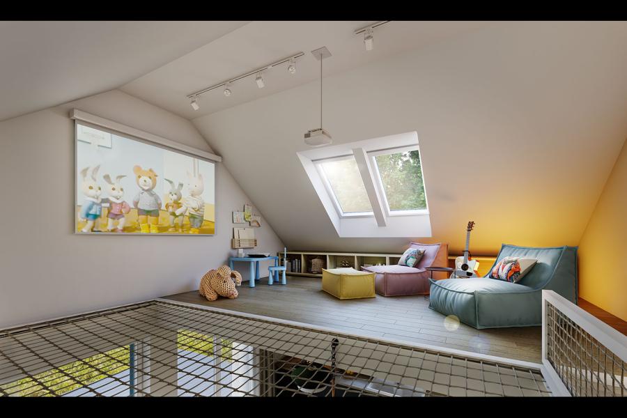 Użytkowe poddasze możemy dowolnie zaaranżować. Zmieszczą się tam 2 dodatkowe sypialnie oraz spora strefa relaksu.