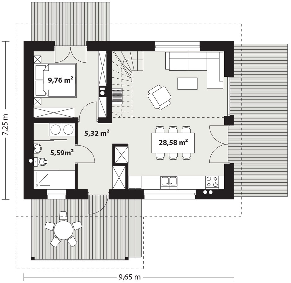 Układ funkcjonalny parteru został przemyślany tak, by zapewnić pełną wygodę. Oprócz salonu z jadalnią i kuchnią, znajdziemy tu komfortową sypialnię (9,76 m²) z bezpośrednim wyjściem na taras oraz ustawną łazienkę. Wejście do budynku chroni klimatyczna, zadaszona weranda, która jest idealnym miejscem na poranną kawę bez względu na pogodę.