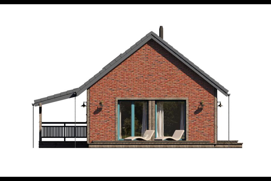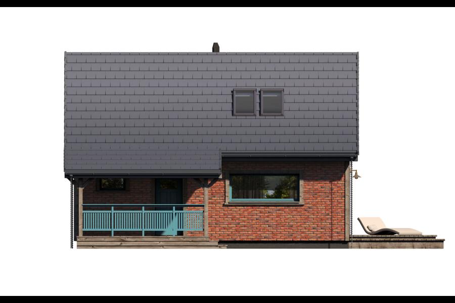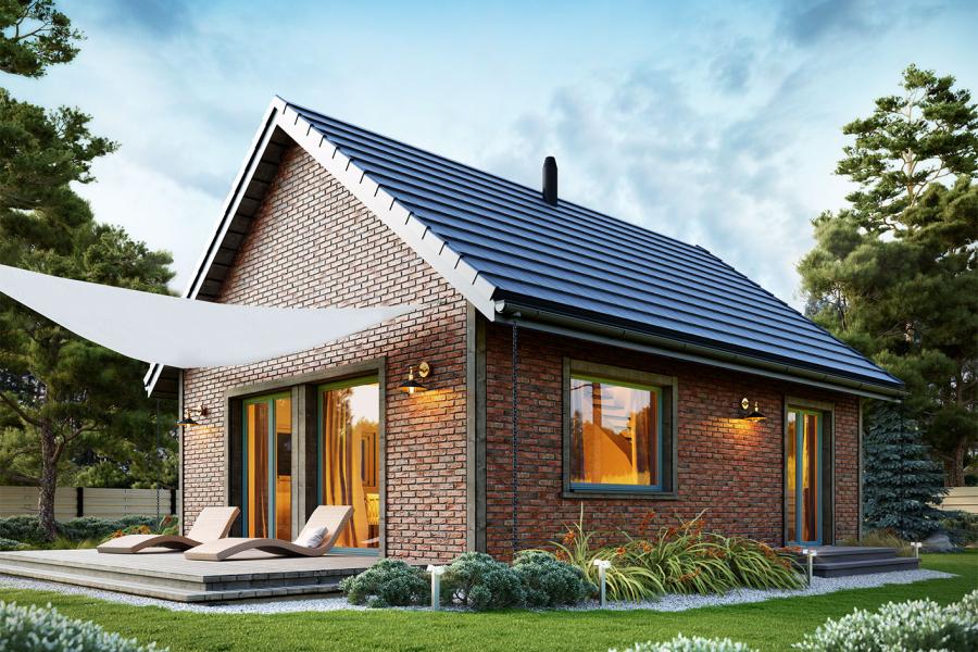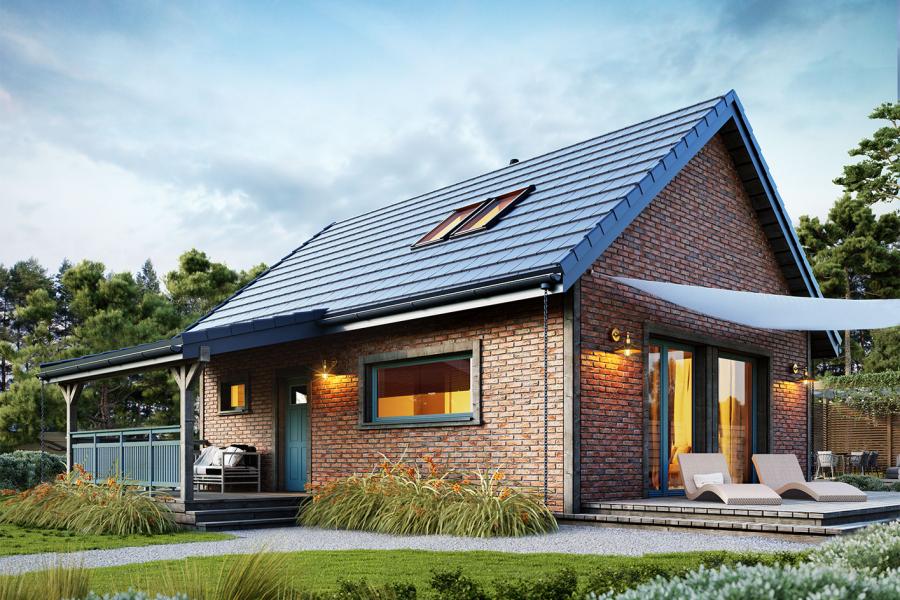 Erna to wyjątkowa propozycja dla osób poszukujących kompaktowego, a jednocześnie niezwykle stylowego domu całorocznego lub letniskowego. Dzięki powierzchni zabudowy poniżej 70 m², projekt ten idealnie wpisuje się w procedurę budowy „na zgłoszenie”, co znacznie upraszcza formalności i przyspiesza realizację marzenia o własnych czterech kątach. Prosta, tradycyjna bryła z dwuspadowym dachem zyskała tu nowoczesny sznyt dzięki zastosowaniu eleganckiej płytki elewacyjnej imitującej cegłę oraz odważnej kolorystyce stolarki okiennej w odcieniu turkusu.
