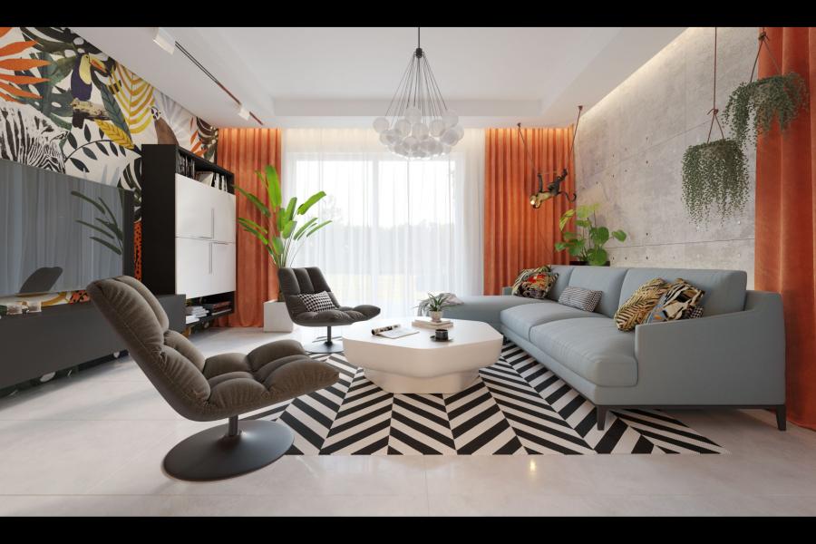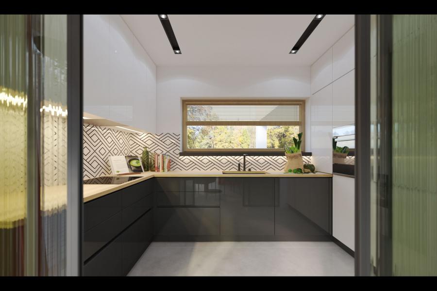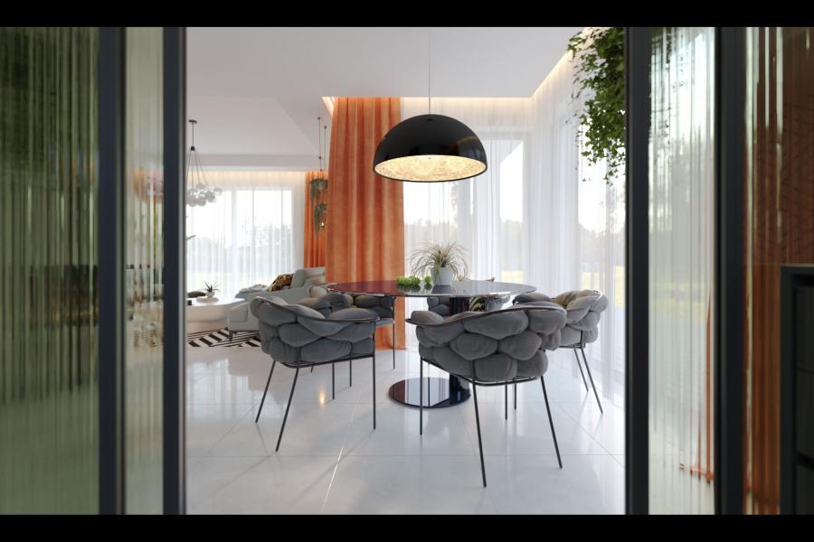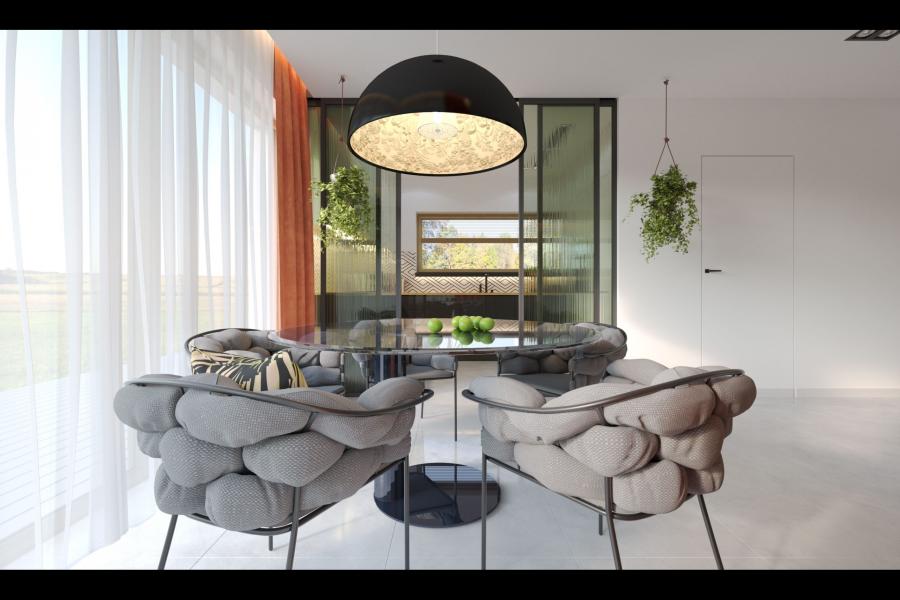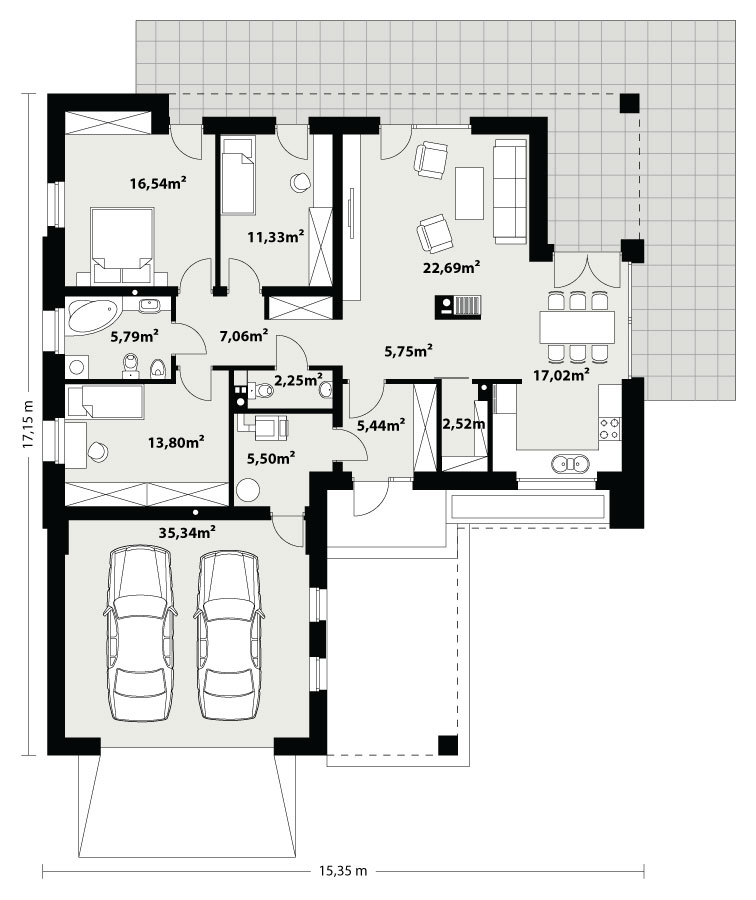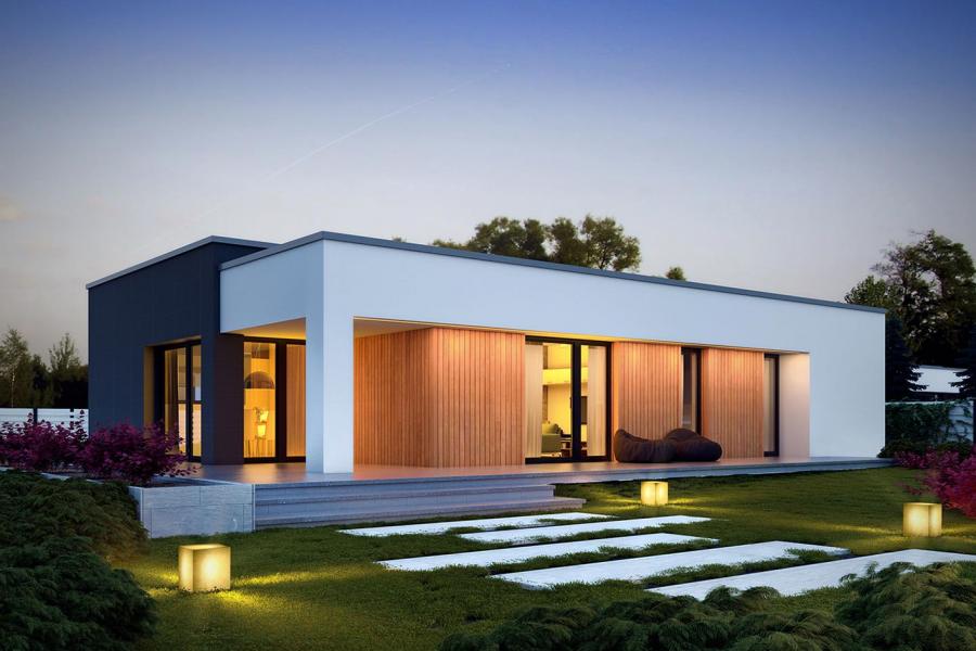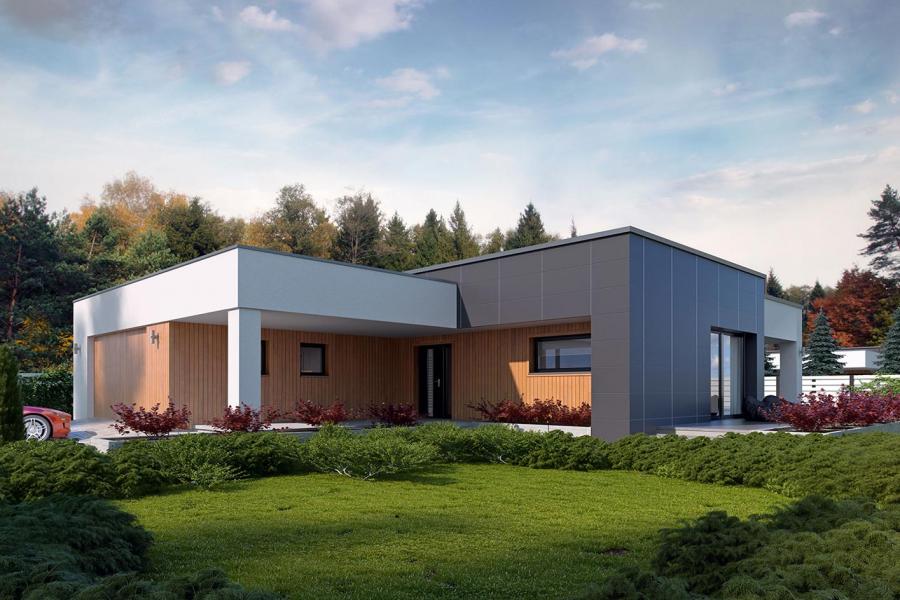 Parterowy dom jednorodzinny, z dwustanowiskowym garażem utrzymany w klimacie nowoczesnej willi. Łączy w sobie współczesny charakter elewacji z prostym, klasycznym układem pomieszczeń. Jest to bardzo wygodny, prosty i funkcjonalny dom, który swoim pełnym programem zapewnia optymalny komfort 4-osobowej rodzinie. W przestronnej części dziennej zaprojektowano duży salon, jadalnię otwierająca się na ogród poprzez ogromne przeszklenie, kuchnię ze spiżarnią oraz wc. Atutem projektu jest duży, częściowo zadaszony taras. Tak zaproponowany, ciekawy i przestronny układ pomieszczeń umożliwia szereg aranżacji. Część nocna to 3 wygodne sypialnie, z czego dwie posiadają wyjście na taras oraz łazienka. W domu zaprojektowano dużą kotłownię dostępną z wiatrołapu, której parametry pozwalają na montaż kotła na każdy rodzaj paliwa, w tym na paliwo stałe oraz dwustanowiskowy garaż. Atutem projektu jest jego prostota zarówno w układzie pomieszczeń jak i w rozwiązaniach elewacji,gdzie nowowczesny styl nadają proste, klasyczne materiały oraz subtelny detal.