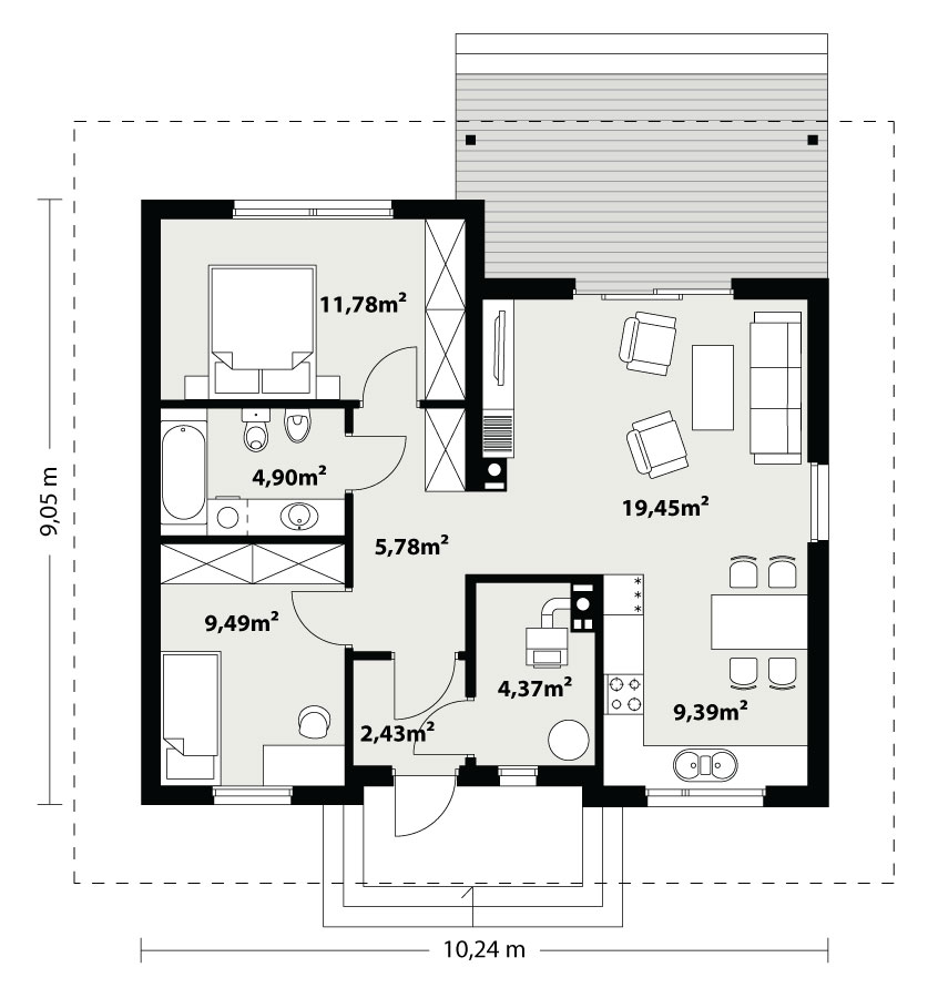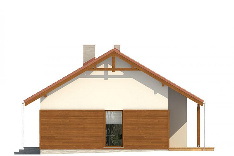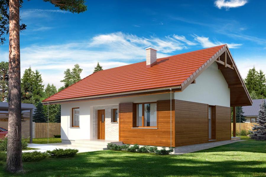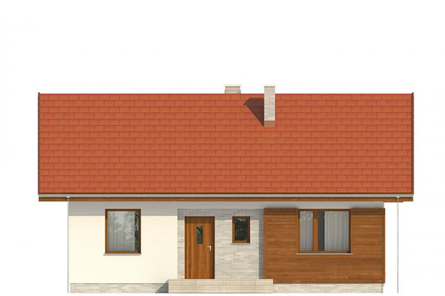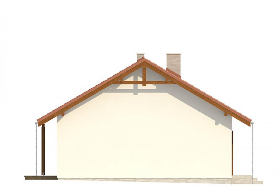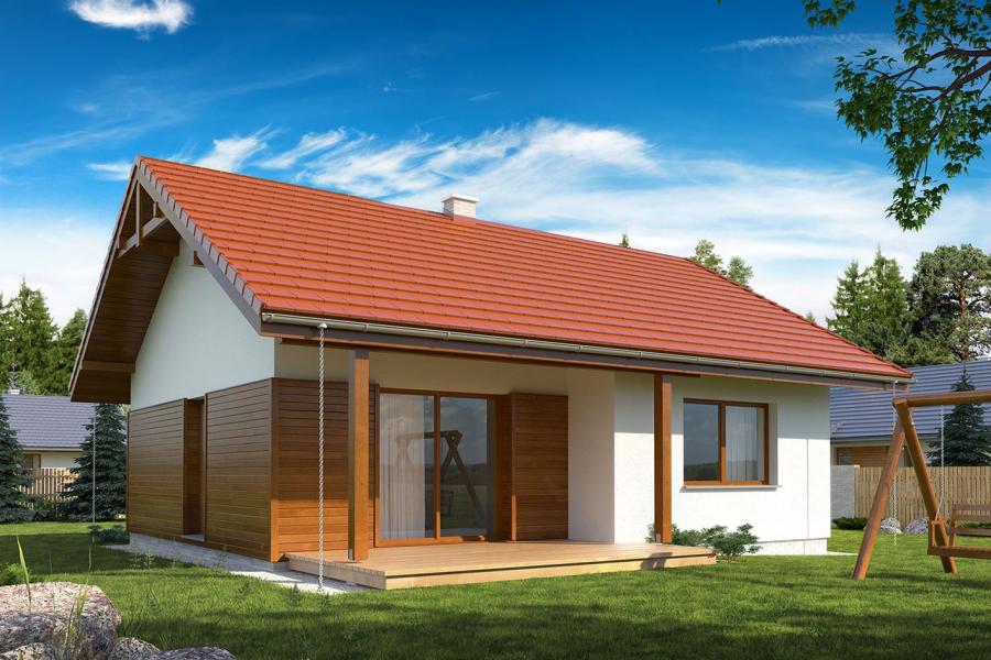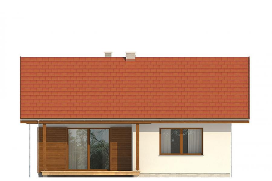Nieduży jednorodzinny budynek mieszkalny, parterowy, zaprojektowany w technologii szkieletu drewnianego. Ergonomiczny i optymalny układ pomieszczeń zapewnia komfort 3-osobowej rodzinie. Funkcjonalnie rozplanowana przestrzeń została wyraźnie podzielona na część dzienną i nocną. Część reprezentacyjna domu, to przestronny salon połączony z jadalnią, który otwiera się na duży, zadaszony taras oraz kuchnia. Oprócz części dziennej, zaprojektowano dwie sypialnie i dużą łazienkę, które stanowią część intymną domu. Wymiary kotłowni umożliwiają montaż kotła na każdy rodzaj paliwa. Sama bryła budynku nawiązuje do archetypu domu jednorodzinnego. Rzut budynku powstał w oparciu o rzut prostokąta, zaś sam dom został przykryty dachem dwuspadowym. Dom tym samym jest tani i prosty w budowie oraz niedrogi w utrzymaniu i eksploatacji. Projekt dostępny jest również w technologii murowanej.