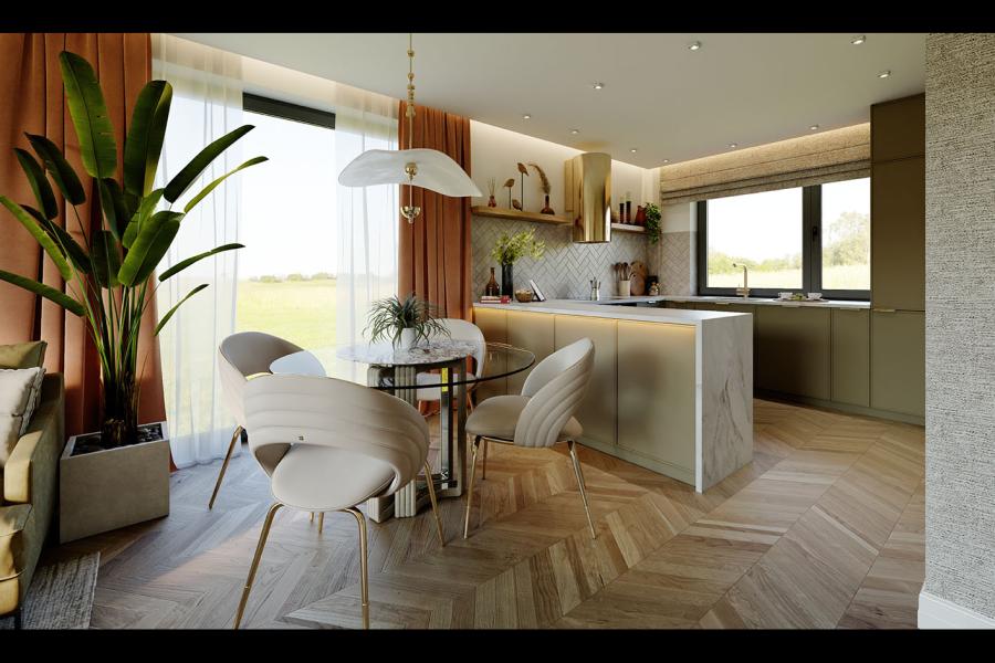 Strefa dzienna – Serce domu Wnętrze Galii 2 zachwyca przemyślanym układem funkcjonalnym. Otwarta strefa dzienna to przestrzeń pełna światła, dzięki dużym przeszkleniom prowadzącym bezpośrednio na taras. Salon z miejscem na kominek płynnie łączy się z jadalnią oraz ustawną kuchnią. Co ważne dla miłośników gotowania – kuchnia została wzbogacona o praktyczną spiżarnię, która ułatwi utrzymanie porządku. W tej części domu znajduje się również osobne WC dla gości, co zwiększa komfort domowników.
