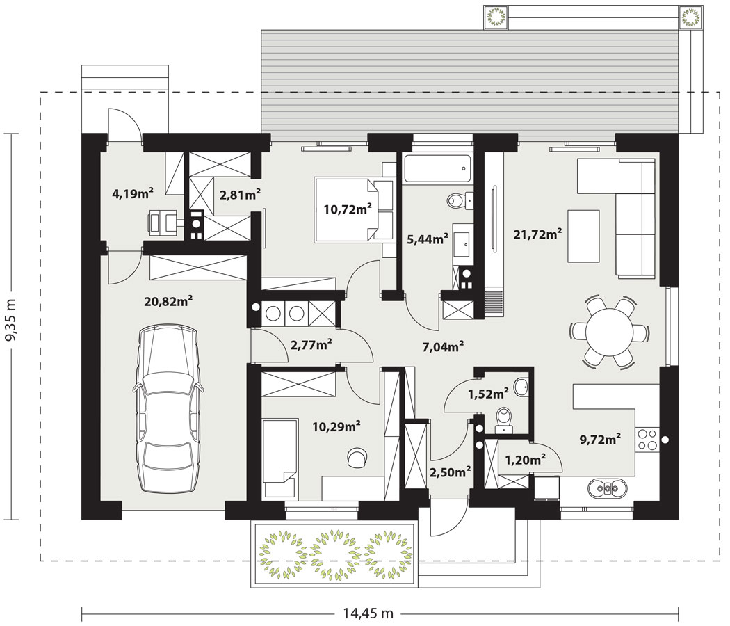 Zaplecze gospodarcze Galia 2 to dom kompletny. Pomiędzy strefą mieszkalną a garażem zaprojektowano przechodnie pomieszczenie gospodarcze, idealne na pralnię. Stanowi ono wygodny bufor oddzielający część czystą domu od jednostanowiskowego garażu i kotłowni. Kotłownia została przystosowana do montażu kotła gazowego lub na paliwo stałe, co daje Inwestorowi elastyczność w wyborze źródła ciepła.