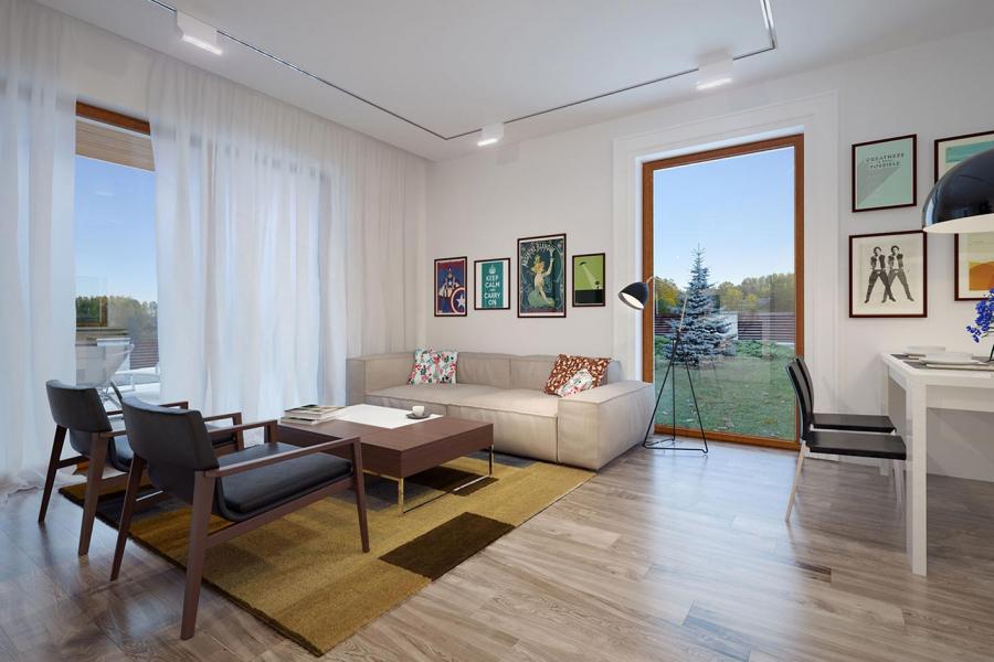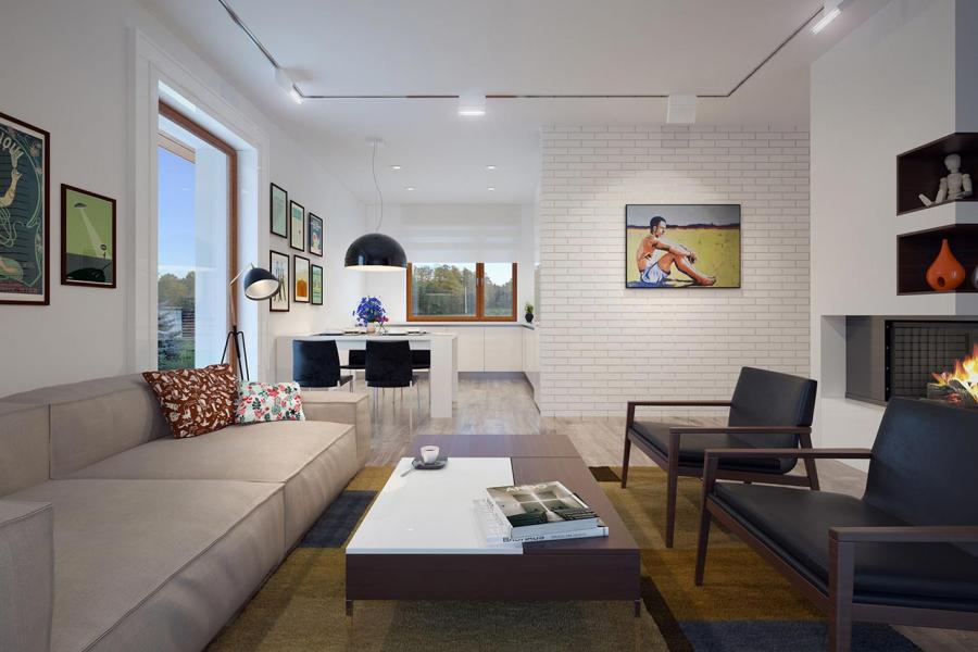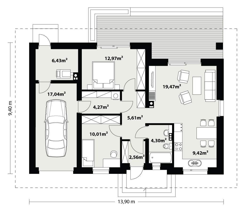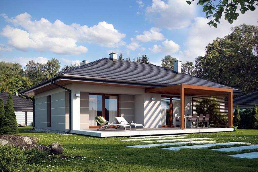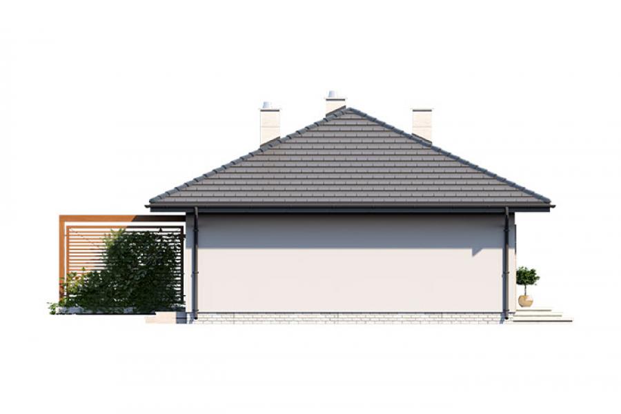 Nieduży jednorodzinny budynek mieszkalny, parterowy, niepodpiwniczony z jednostanowiskowym garażem. Funkcjonany układ pomieszczeń zapewnia komfort 3-osobowej rodzinie. Ergonomicznie i optymalnie rozplanowana przestrzeń została wyraźnie podzielona na część dzienną, nocną i gospodarczą. Część reprezentacyjna domu, to przestronny salon połączony z jadalnią, który otwiera się na duży, zadaszony taras oraz kuchnia. Oprócz części dziennej, zaprojektowano dwie sypialnie i dużą łazienkę, które stanowią część intymną domu. Duża kotłownia, garaż oraz pomieszczenie gospodarcze mogące pełnić funkcje spiżarni i pralni przewidziano w części gospodarczej domu. Wymiary kotłowni umożliwiają montaż kotła na każdy rodzaj paliwa. Rzut budynku powstał w oparciu o rzut prostokąta, zaś sam dom został przykryty dachem wielospadowym. Dom tym samym jest tani i prosty w budowie oraz niedrogi w utrzymaniu i eksploatacji.