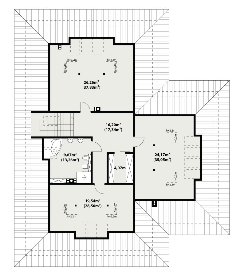 | Powierzchnia użytkowaDla domów parterowych: Suma powierzchni użytkowych wszystkich pomieszczeń bez garażu. Dla domów z poddaszem (dach spadzisty): Suma powierzchni użytkowych wszystkich pomieszczeń bez garażu i strychu. Na poddaszu, pod skosami dachu powierzchnię użytkową liczono wg zasady: - powyżej 2,2m wysokości pomieszczenia powierzchnia liczona w 100%, - pomiędzy 1,4m a 2,2m w 50%, - poniżej 1,4m powierzchnia nie jest brana pod uwagę. | 266.57 m² |