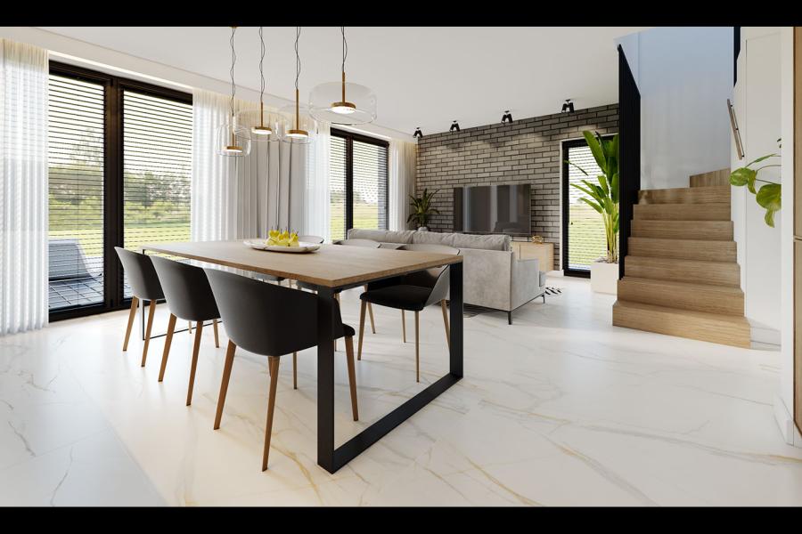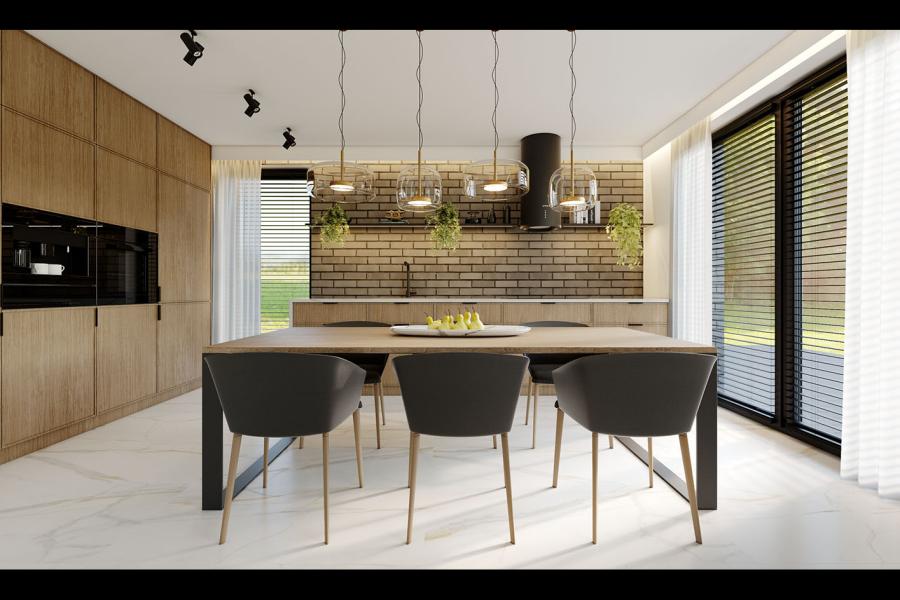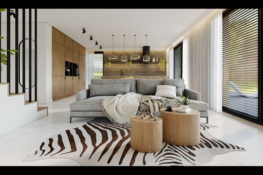 Wizytówką tego projektu jest nowoczesna elewacja. Surowy, elegancki charakter osiągnięto dzięki połączeniu blachy na rąbek w kolorze antracytowym z ciemną płytką elewacyjną. Ten chłodny minimalizm idealnie przełamują panele w odcieniu naturalnego drewna. Duże przeszklenia wpuszczają do wnętrza mnóstwo naturalnego światła i płynnie łączą strefę dzienną z ogrodem.