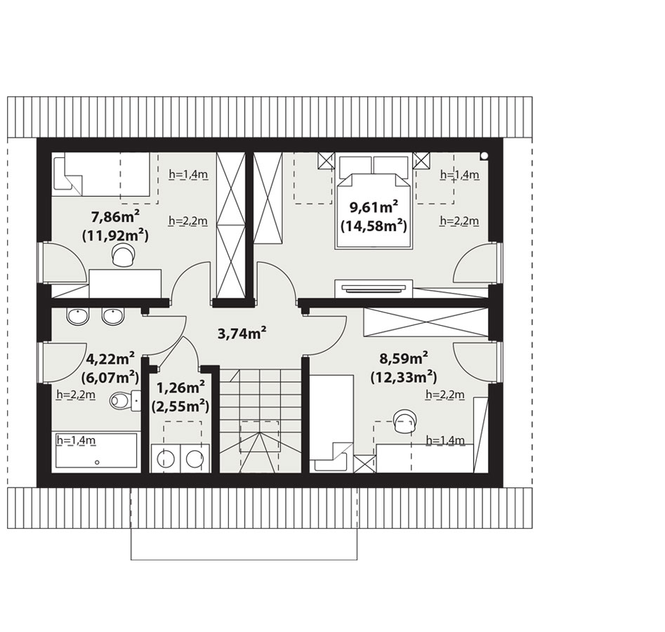 | Powierzchnia użytkowaDla domów parterowych: Suma powierzchni użytkowych wszystkich pomieszczeń bez garażu. Dla domów z poddaszem (dach spadzisty): Suma powierzchni użytkowych wszystkich pomieszczeń bez garażu i strychu. Na poddaszu, pod skosami dachu powierzchnię użytkową liczono wg zasady: - powyżej 2,2m wysokości pomieszczenia powierzchnia liczona w 100%, - pomiędzy 1,4m a 2,2m w 50%, - poniżej 1,4m powierzchnia nie jest brana pod uwagę. | 89.33 m² |