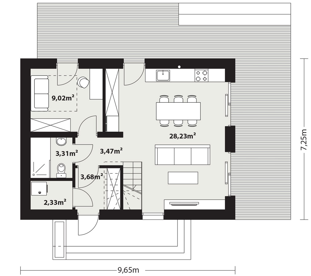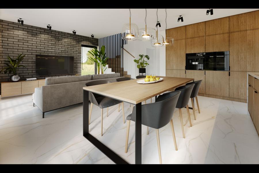 Sercem domu jest otwarta strefa dzienna o powierzchni ponad 28 m², gdzie salon, jadalnia i kuchnia tworzą spójną całość. Kuchnia została zaprojektowana w ergonomicznym układzie z możliwością wydzielenia funkcjonalnego półwyspu, który idealnie sprawdzi się jako miejsce na szybką kawę. Dzięki ogromnym przeszkleniom wnętrze naturalnie łączy się z zewnętrznym, zadaszonym częściowo tarasem w kształcie litery L, który okala dom, oferując przestrzeń do relaksu bez względu na porę dnia. Co ważne, na parterze wygospodarowano dodatkowy pokój (9,02 m²) – idealny na gabinet do pracy zdalnej lub sypialnię gościnną.