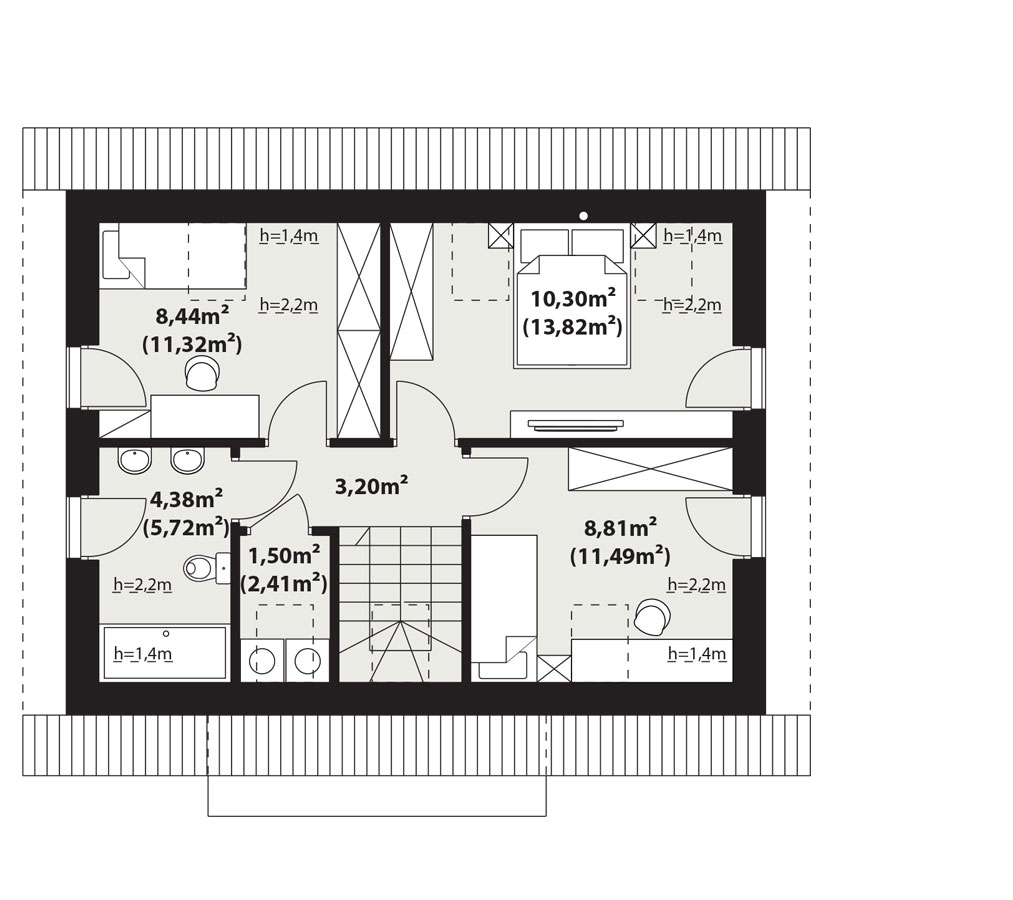| Powierzchnia użytkowaDla domów parterowych: Suma powierzchni użytkowych wszystkich pomieszczeń bez garażu. Dla domów z poddaszem (dach spadzisty): Suma powierzchni użytkowych wszystkich pomieszczeń bez garażu i strychu. Na poddaszu, pod skosami dachu powierzchnię użytkową liczono wg zasady: - powyżej 2,2m wysokości pomieszczenia powierzchnia liczona w 100%, - pomiędzy 1,4m a 2,2m w 50%, - poniżej 1,4m powierzchnia nie jest brana pod uwagę. | 86.67 m² |