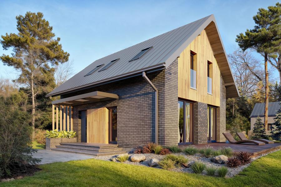 - Nowoczesny design: Efektowne połączenie blachy na rąbek, drewna i dużych przeszkleń.