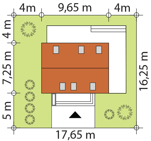 Minimalne wymiary działki wymagane dla tego projektu to zaledwie 15,65 m szerokości oraz 16,25 m długości, przy zachowaniu ustawowych 4 metrów odległości od granic. Tak kompaktowe wymiary pozwalają na realizację marzenia o własnym domu nawet na bardzo małych lub nieregularnych parcelach, co otwiera drogę do atrakcyjniejszych lokalizacji blisko centrów miast.