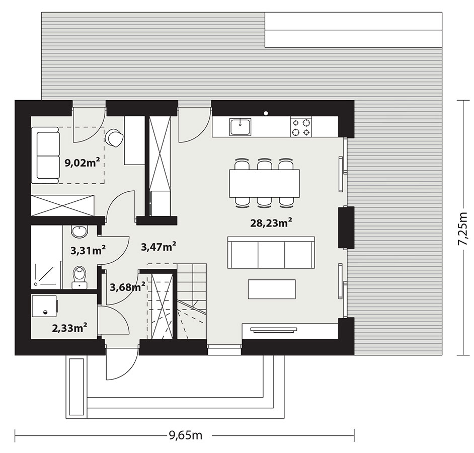 - Strefa dzienna: Otwarta przestrzeń łącząca salon z jadalnią i kuchnią (łącznie ok. 28m²) sprzyja integracji domowników.