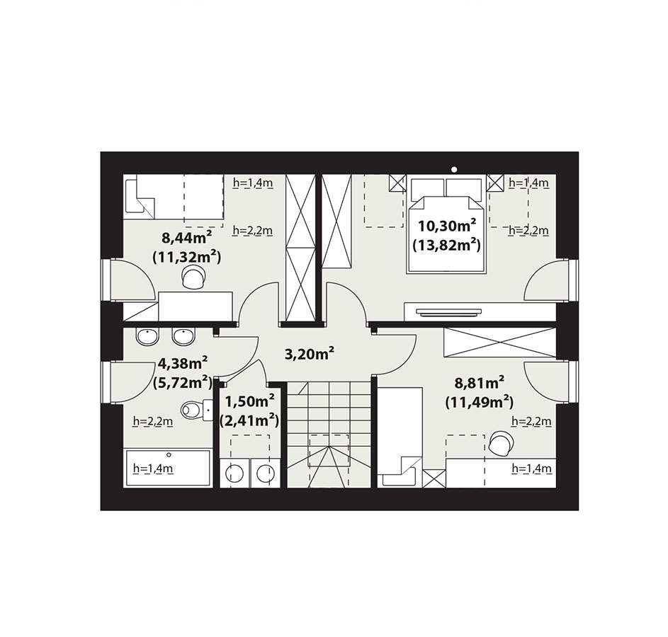 | Powierzchnia użytkowaDla domów parterowych: Suma powierzchni użytkowych wszystkich pomieszczeń bez garażu. Dla domów z poddaszem (dach spadzisty): Suma powierzchni użytkowych wszystkich pomieszczeń bez garażu i strychu. Na poddaszu, pod skosami dachu powierzchnię użytkową liczono wg zasady: - powyżej 2,2m wysokości pomieszczenia powierzchnia liczona w 100%, - pomiędzy 1,4m a 2,2m w 50%, - poniżej 1,4m powierzchnia nie jest brana pod uwagę. | 86.67 m² |