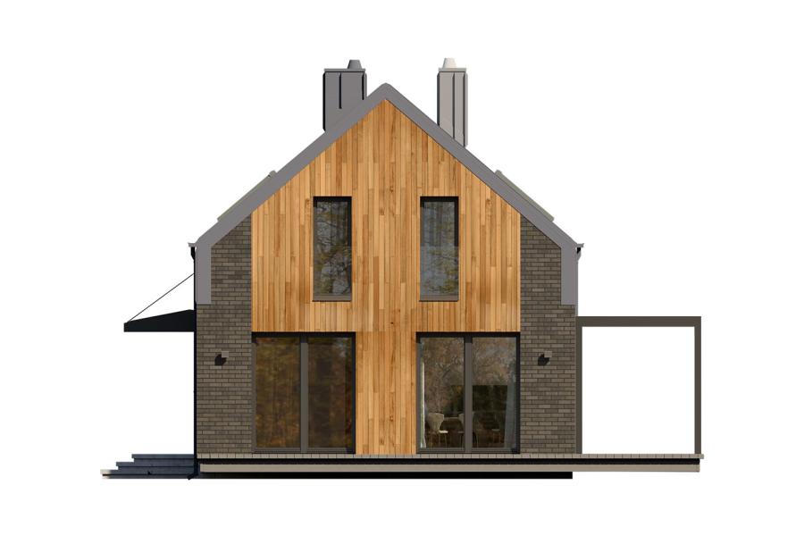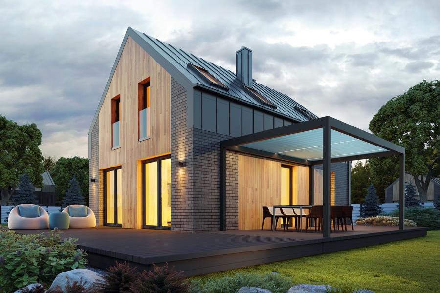 - Paneli w kolorze naturalnego drewna, które ocieplają wizerunek domu i akcentują strefy okienne.