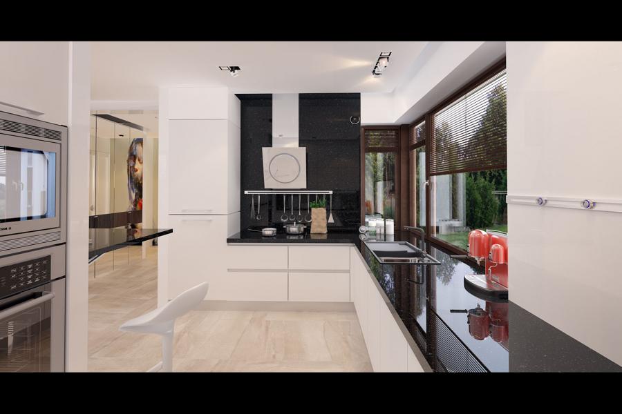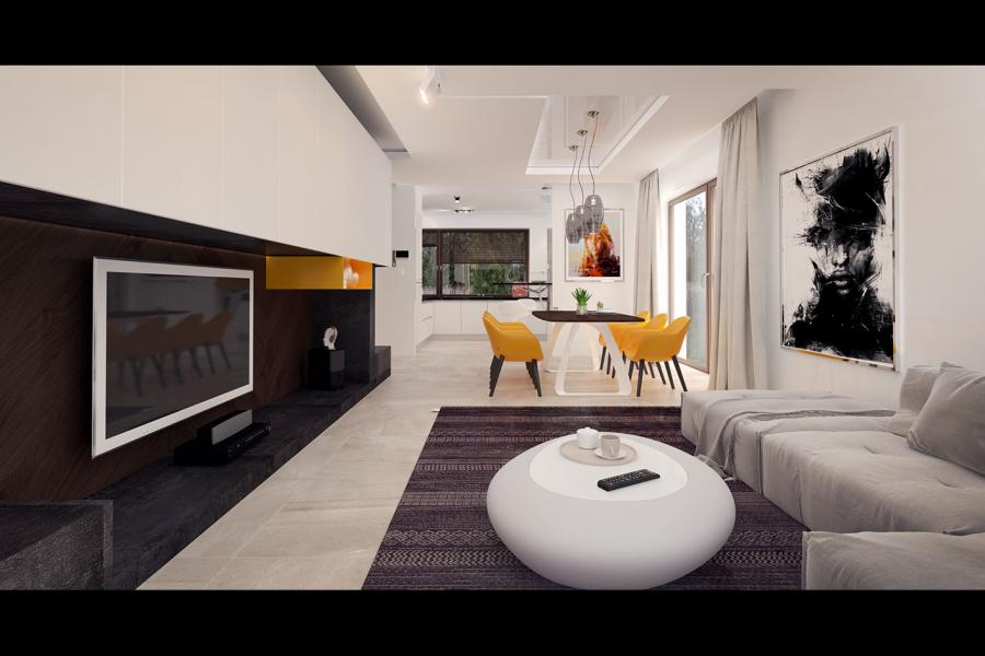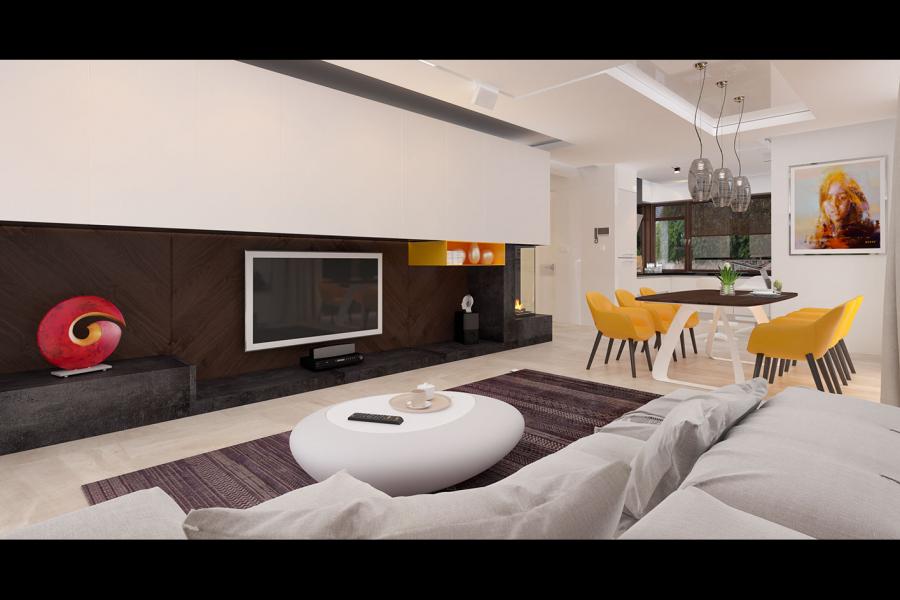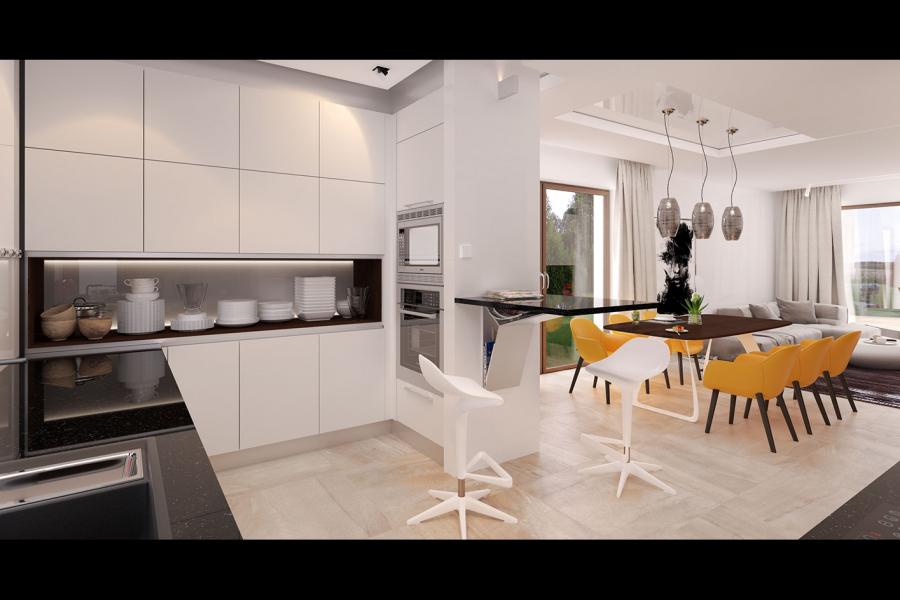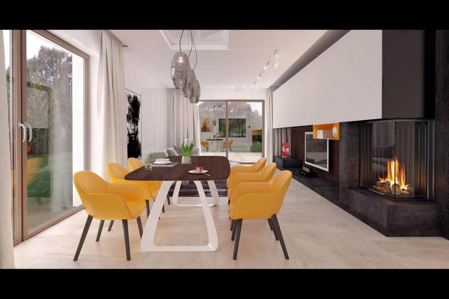 Sercem domu jest przestronna strefa dzienna, idealnie dopasowana do potrzeb 4-osobowej rodziny. Przemyślane połączenie salonu, jadalni i kuchni tworzy jasną, otwartą przestrzeń. Wzrok przyciągają tu imponujące, przesuwne przeszklenia, które płynnie łączą wnętrze z dużym, zadaszonym tarasem – to wymarzone miejsce na relaks i poranną kawę, niezależnie od warunków pogodowych. W chłodniejsze dni domowników ogrzeje zlokalizowany w rogu salonu nowoczesny kominek. Kuchnia została zaprojektowana z dbałością o ergonomię: oferuje dużo przestrzeni roboczej pod narożnym oknem oraz praktyczny duży stół obok kuchni, idealny do szybkich posiłków.