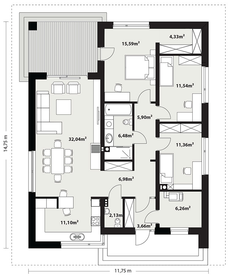 - Trwała i ekonomiczna technologia: Murowane ściany i żelbetowy strop w prostej bryle z kopertowym dachem to gwarancja taniej budowy i eksploatacji.