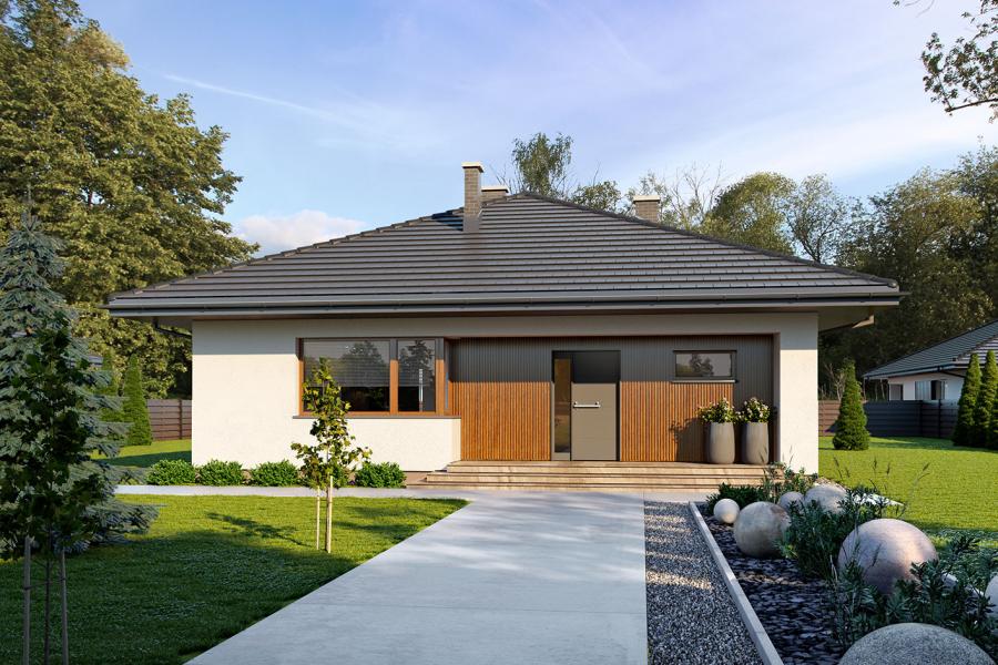 Irysek 5 to projekt parterowego domu, który udowadnia, że klasyczna bryła na rzucie prostokąta może zaoferować maksymalną funkcjonalność i nowoczesny design. Zastosowanie kopertowego dachu oraz tradycyjnej technologii (dwuwarstwowe ściany z pustaka ceramicznego ocieplone styropianem i solidny żelbetowy strop) sprawia, że budynek jest prosty w budowie oraz ekonomiczny w eksploatacji. Jasny tynk elewacji urozmaicono ciepłymi, pionowymi akcentami z drewna lub kompozytu, tworząc spójną, elegancką całość, która doskonale wpisze się w każde otoczenie.