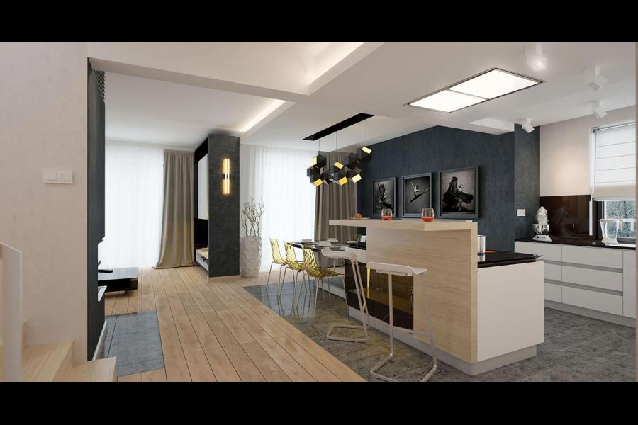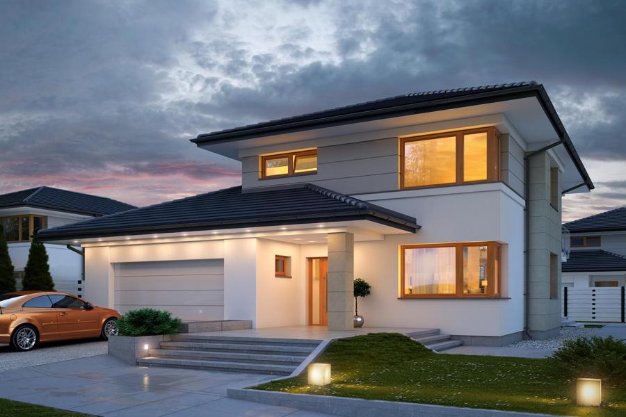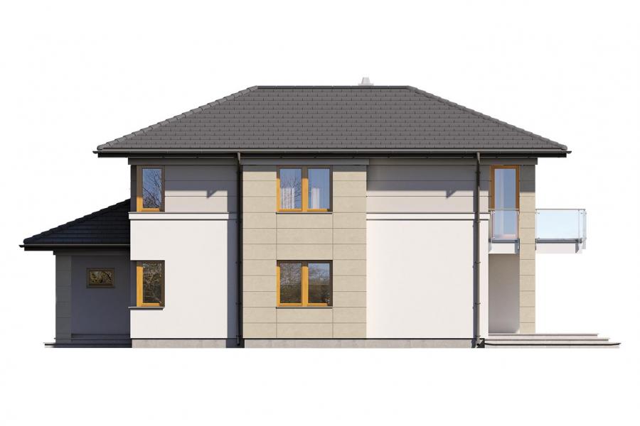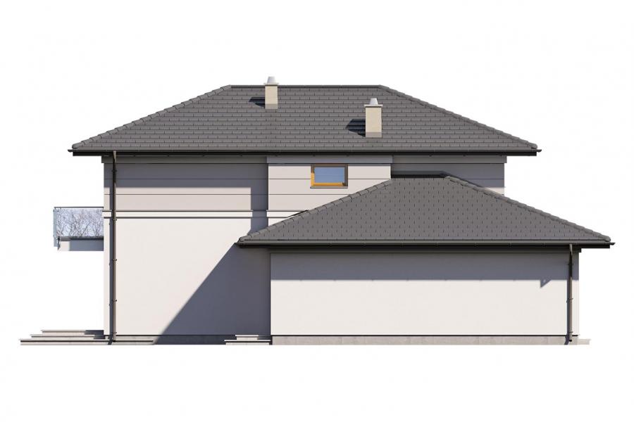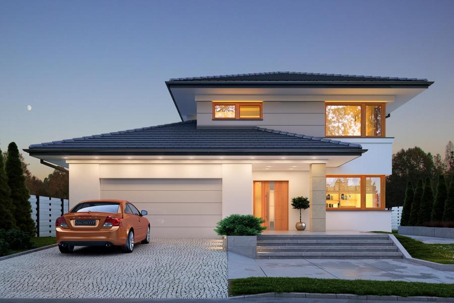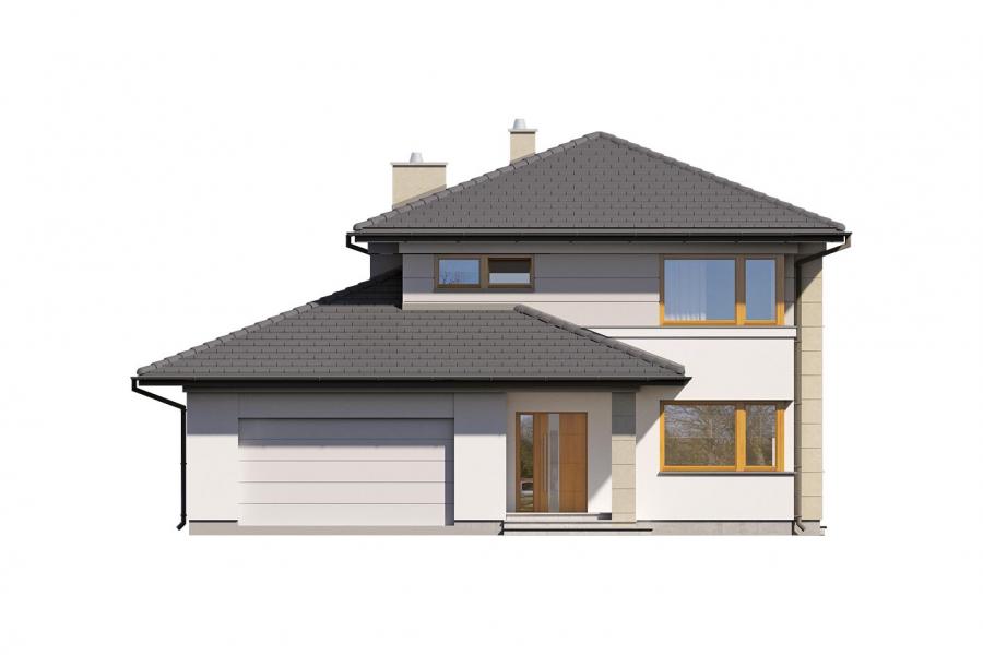 Karat 2, to projekt nowoczesnego domu piętrowego przeznaczonego dla 4-osobowej rodziny. Jest to typowo miejska rezydencja o reprezentacyjnym wyglądzie i optymalnej powierzchni użytkowej. Posiada bogaty program funkcjonalny, rozłożony na dwóch pełnych kondygnacyjnych, który zapewni komfort nawet dla wymagających inwestorów. Parter zaprojektowano jako otwartą przestrzeń dzienną, złożoną z połączonego salonu, jadalni i kuchni. Przewidziano tutaj także dodatkowy pokój, który można wykorzystać jako gabinet lub dodatkową sypialnię. Na parterze znajduje się również duża kotłownia, na każdy rodzaj paliwa oraz garaż na dwa miejsca postojowe. Na piętrze zaprojektowano 3 sypialnie i łazienkę. Główna sypialnia ma zapewnioną własną garderobę oraz łazienkę. Taką dodatkową przestrzeń można według potrzeb przerobić np. na kącik do pracy. Karat 2 zachwyca ciekawą, ponadczasową, klasyczną bryłą ujętą we współczesny elegancki wizerunek. Rezydencja ta stanowi doskonałą propozycję dla inwestorów poszukujących komfortowego domu w estetycznym wydaniu.