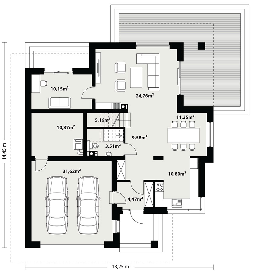 | Powierzchnia zabudowyPowierzchnia terenu, zajęta przez budynek w stanie wykończonym, bez tarasów, schodów zewnętrznych i podjazdów (PN-ISO 9836: 1997) | 155.91 m² |