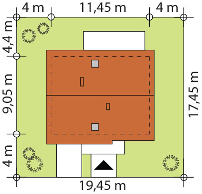 | Wysokość kalenicyMaksymalna wysokość budynku mierzona od poziomu terenu przy wejściu do najwyżej położonego punktu dachu. | 9 m |